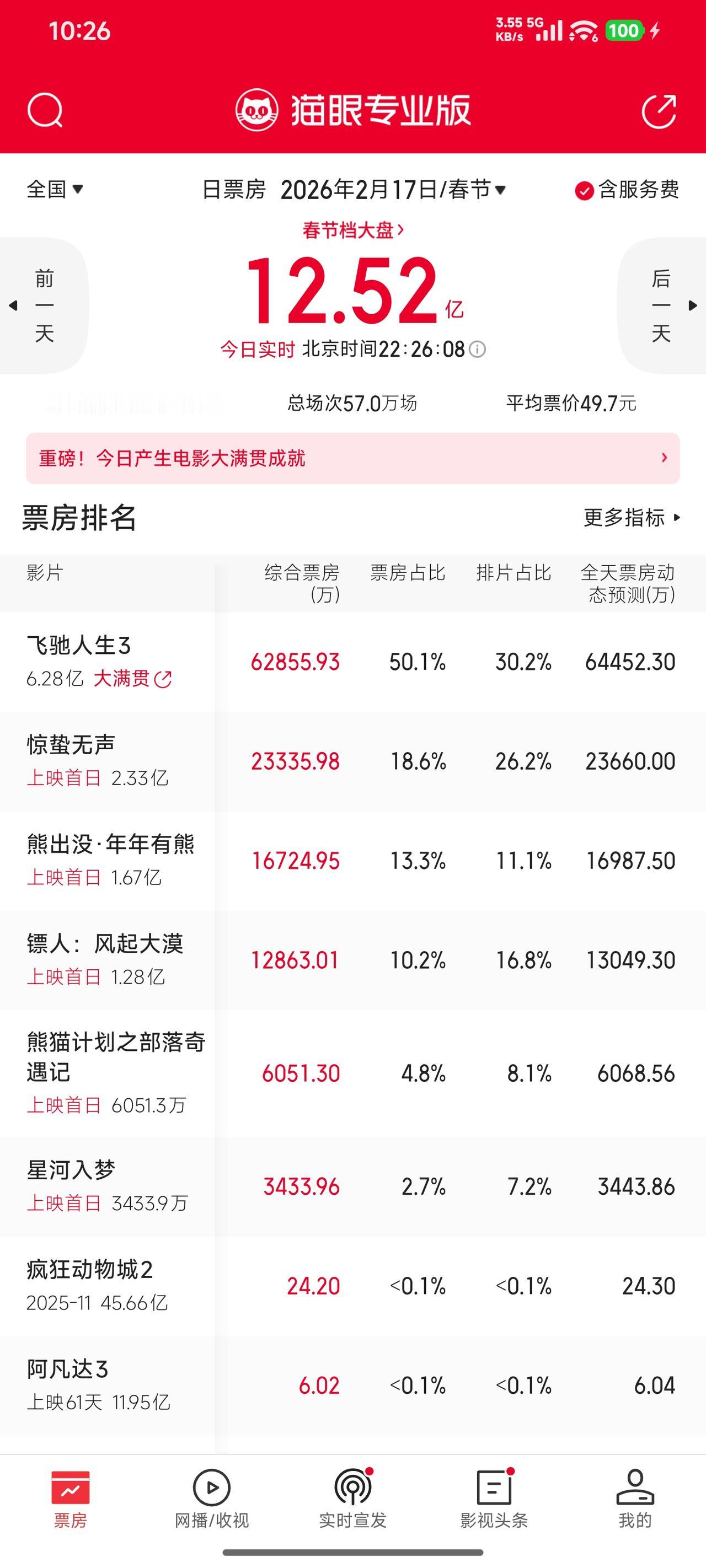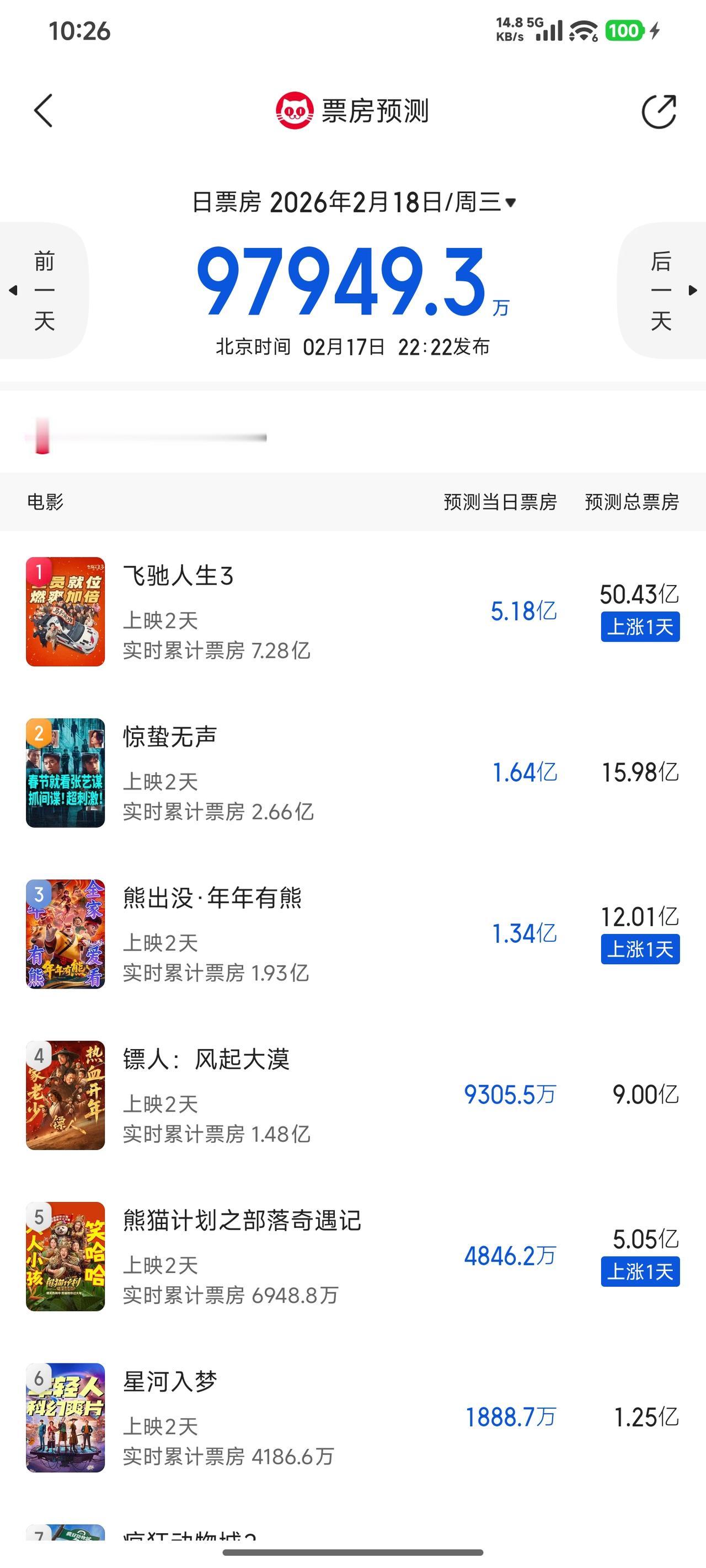 春节档第一天票房出来了,《飞驰人生3》领跑,《熊出没》第三。猫眼预测《飞驰人生3》最终票房可以达到50亿,《熊出没》12亿。我比较看好《熊出没》最终能排到第二名。今年春节档主要是缺少合家欢的电影,《熊出没》然口碑一直不错,但也只适合比较小的孩子看,缺乏去年《哪吒2》那样足够出圈的电影。