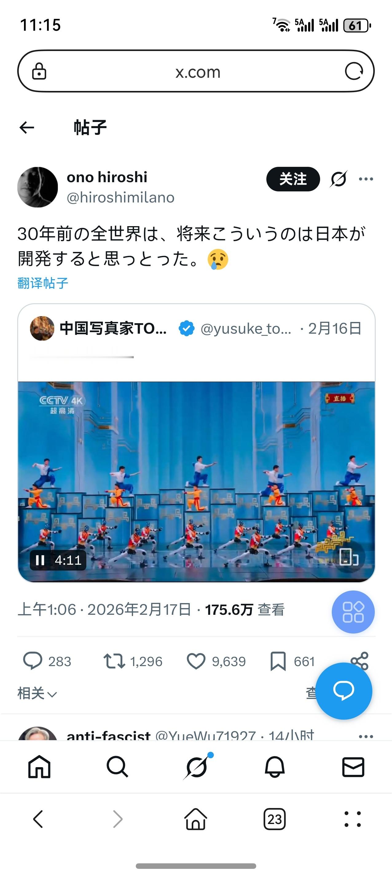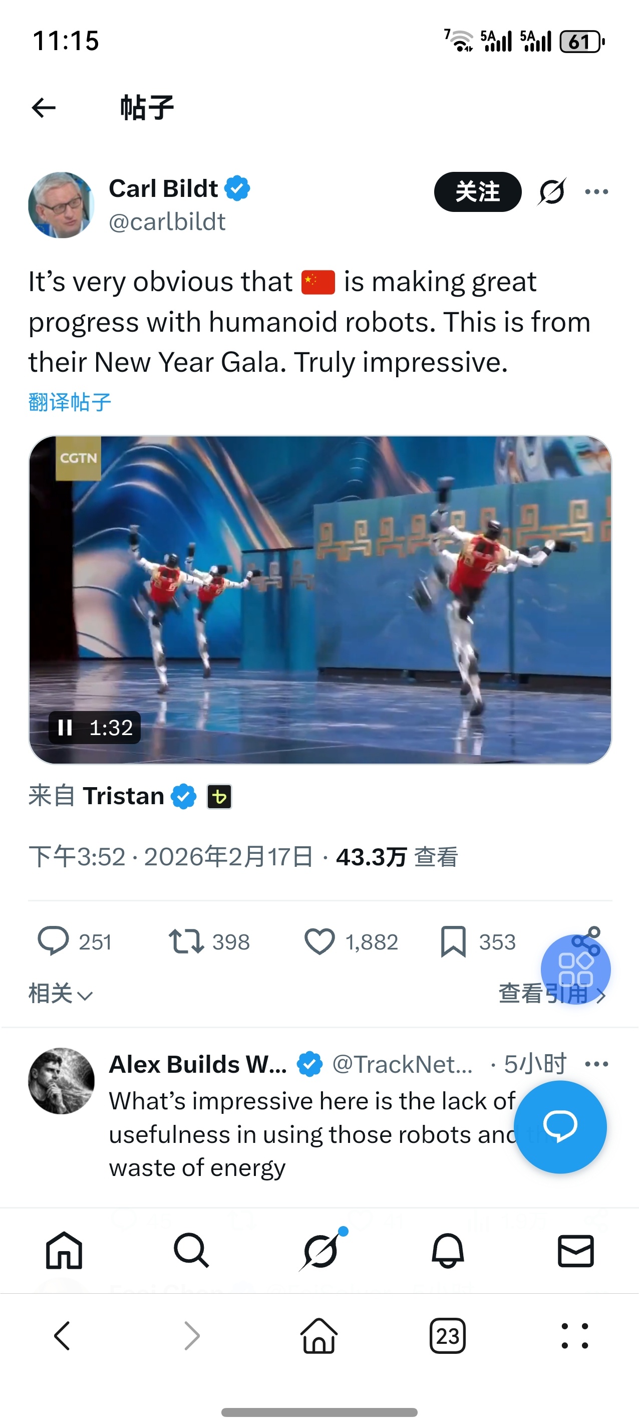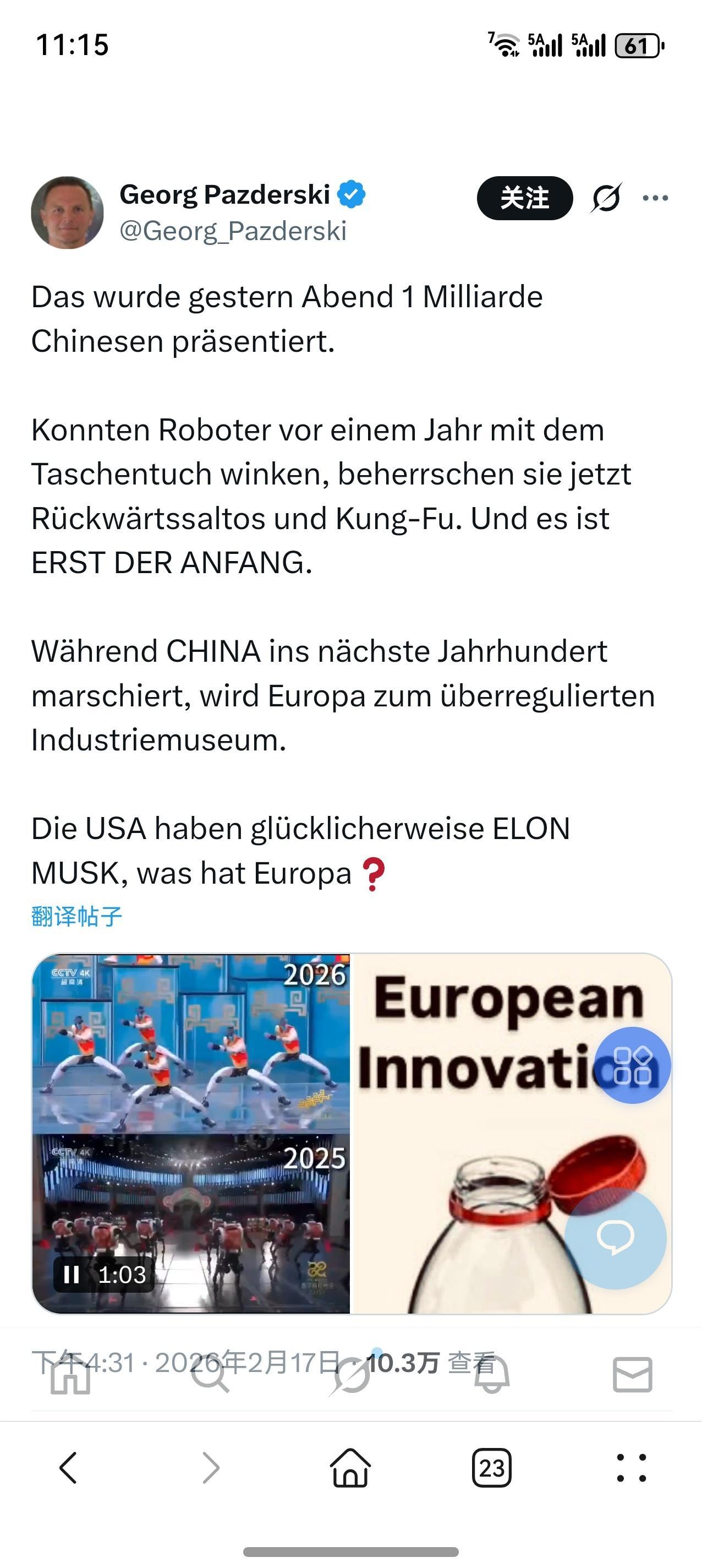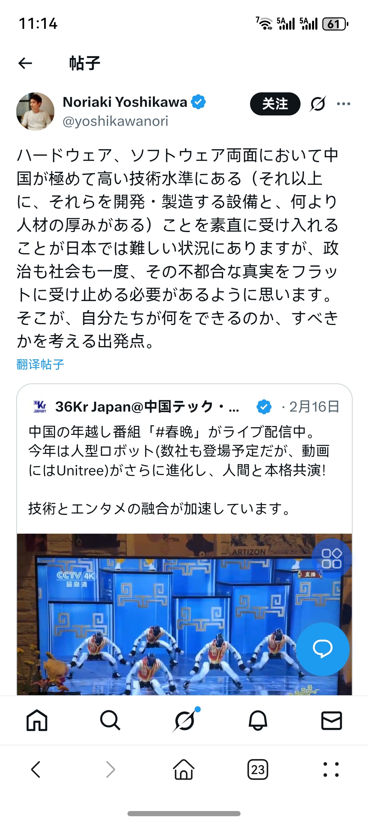 评论区就不截图了,只是想吐槽,男拳女拳都不如机器人打拳,春晚武术机器人在境外引发的B动静远比国人想象的大。境外借华撒娇的一派和反华魔怔的一派都在借着这个新闻无限放大上升,互相攻讦,大有赤色生化斯坦明天成立炸平美国停止超级地球转动之感。在国际舆论场上,中国往往扮演一个npc的角色。但随着我们这头房子里的大象愈发藏不住自己,大争之世里托华言志的人会越来越多。