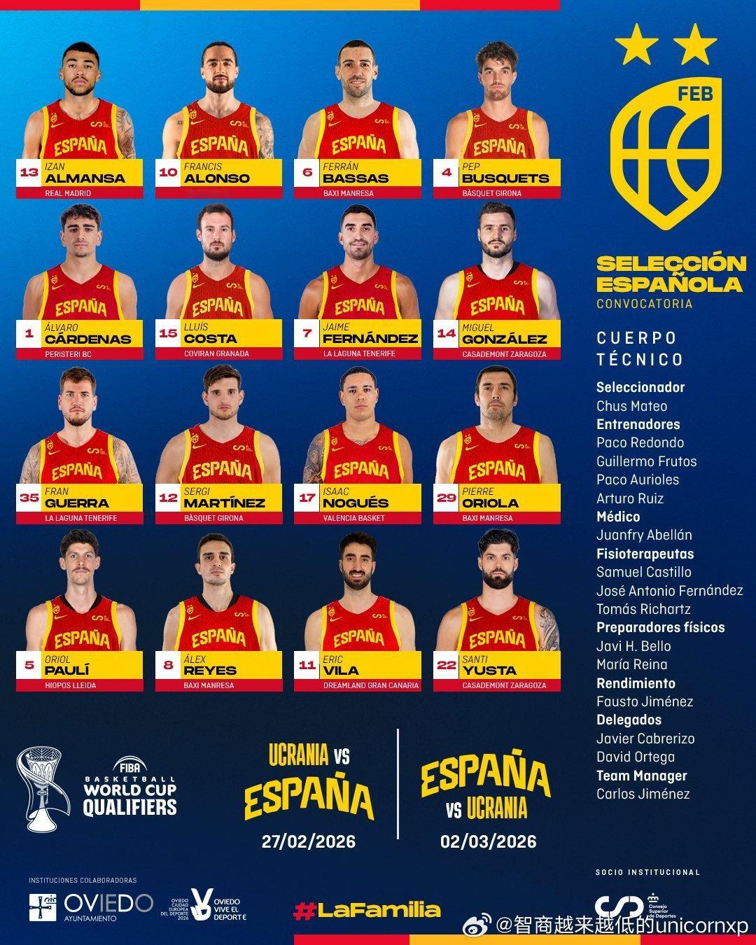 西班牙男篮宣布16人世预赛第二窗口期集训名单FIBA欧洲篮球