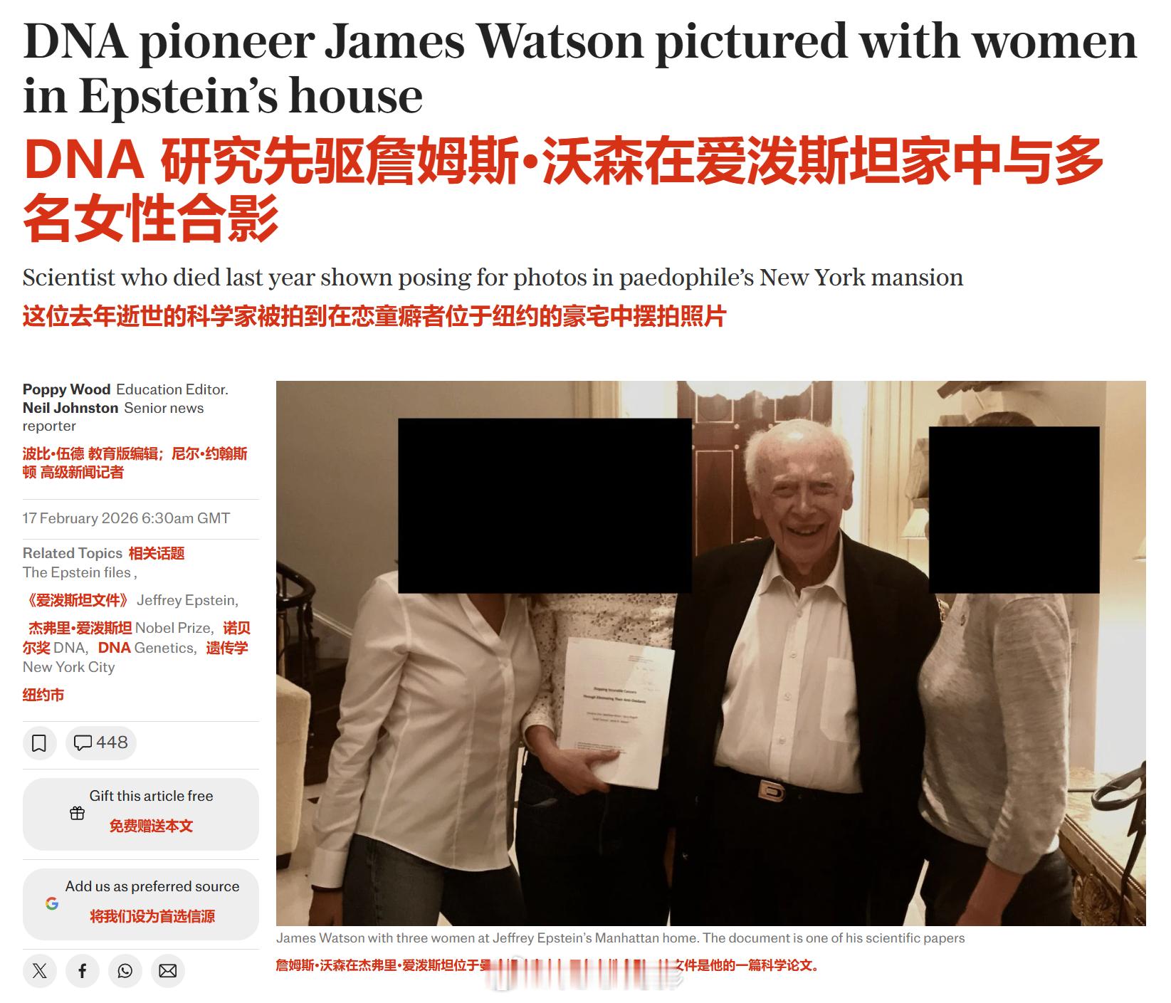 《每日电讯报》挖出的图片显示,已于去年 11 月去世、享年 97 岁的詹姆斯·沃森,在这名恋童癖者位于曼哈顿的联排别墅内一处宏伟的接待室内,面带微笑,与三名年轻女性并肩而立。