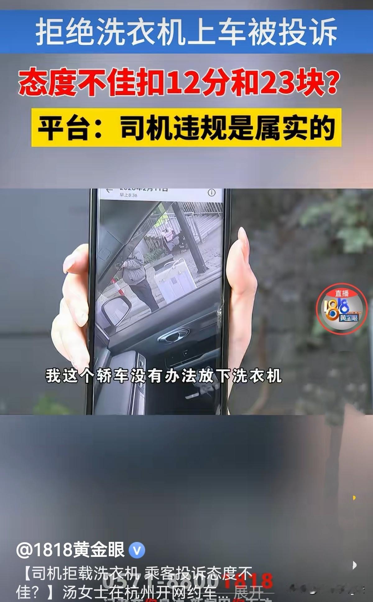 “鸡蛋里挑骨头?”浙江台州,女子是跑网约车5年的老司机,被平台认可的优质驾驶员,接单一顾客要带一台洗衣机,她的后备箱装不下,请对方取消订单,还建议他叫货拉拉。对方没说啥直接取消。可后来女子被平台扣了12分,罚款23元。女子这才知道取消订单的顾客把她投诉了,说她态度不佳!女子说与顾客没任何的冲突,他们就为了得到平台优惠券,故意差评,真的觉得委屈!她坚持让平台退还23元钱,觉得钱是小事,就是咽不下这口气! 汤女士是台州人,在杭州扎根20余年,跑网约车也整5年了。 凭借着踏实稳重、少言多做的性子,她一路做到平台钻石司机,服务分常年稳居高位,是乘客眼中靠谱、平台认可的优质驾驶员。 5年来,她始终小心翼翼,接单只核对尾号,行车稳当安静,从不与乘客多言争执,更别提态度恶劣。 对她而言,网约车不仅是谋生的饭碗,更是需要用心维护的信誉。 2月11日早上8点28分,和平日一样,汤女士准时上线接单。系统很快派来一单短途起步价订单,全程不过3公里。 尽管路程短,她还是一丝不苟地赶去接驾,光是抵达上车点就花了七八分钟。 可当她停稳车辆,看清乘客身边的物品时,看一名年轻男子身旁,赫然立着一台体积庞大的洗衣机。 汤女士开的是普通家用轿车,后备箱空间本就有限。她一眼就判断出,这台洗衣机别说是正常放入,就算强行挤压,后备箱门也根本无法关闭,上路不仅违法,还存在极大安全隐患。 出于对安全和规则的负责,她立刻温和地向乘客解释:帅哥,我这是轿车,后备箱太小,洗衣机实在装不下,麻烦您取消一下订单吧。 怕乘客不理解,还贴心给出建议,让他叫个货拉拉。 她全程语气平和,没有一丝不耐烦,更没有半句争执。男子听完没有异议,当场自行取消订单。 平台也判定取消责任在乘客,还自动为汤女士发放了2.51元的空驶补偿费。 在汤女士看来,这件事到此就圆满结束了。双方沟通顺畅,无吵无闹,责任清晰,她甚至没把这单小事放在心上,继续投入下一趟行程。 可她万万没想到,平静之下,一场无妄之灾正在等着她。 当天9点43分,平台投诉通知突然弹出:该乘客以“服务态度不佳”为由,对她发起投诉。 汤女士当场愣住,满心都是不解和委屈。她反复回想当时的场景,自己全程礼貌沟通,没有顶撞、没有冷漠,怎么就突然态度不好了? 更让她崩溃的是,2月5日至12日正是平台考核周期,此前她已遭遇过两次莫名投诉,加上这一次,恰好满三次。 平台直接以“考核期内不少于3位乘客反馈服务不达标”为由,认定汤女士有责,扣除12分服务分,并处23元违约金。 12分服务分,意味着她要踏踏实实跑完300单才能慢慢恢复;23元钱,数额不大,却像一记耳光,打在她5年坚守的信誉上。 汤女士越想越气,越想越委屈。她怀疑,部分乘客为了薅平台优惠券,故意恶意投诉、无理差评,而平台仅凭投诉数量简单判责,连基本的事实核实都没有,就让无辜司机承担后果。 自己明明坚守规则、礼貌服务,却要为莫须有的“态度不佳”买单,这口气,她实在咽不下去。 钱是小事,公道是大事。为了给自己讨一个说法,汤女士主动联系媒体,将这段委屈经历公之于众。 好在经过申诉与媒体介入,平台最终将23元违约金退还给汤女士。 可对于扣除的12分服务分,平台依旧坚持违规判定属实,无法撤销。 平台解释称,单一投诉不会直接判责,最终结果是结合考核期内多位乘客反馈综合认定,此次返还罚金也属于特殊申请处理。 看着失而复得的23元钱,汤女士没有丝毫轻松。她不想再继续折腾,只打算默默跑完300单,把分数一点点挣回来。 可这件事留下的阴影,她时常坐在驾驶座上感慨,网约车司机风里来雨里去,起早贪黑只为挣一份辛苦钱,既要遵守规则保证安全,又要应对乘客各种不合理要求。 可一旦遭遇恶意投诉,连一个说理的地方都那么难找。 汤女士的遭遇曝光后,迅速引发众多网约车司机共鸣。 有人吐槽乘客要求拉货不载人,拒绝后照样被投诉判责。 有人遇到乘客想把自行车塞进后座,被拒后同样恶意投诉。 无数司机在评论区道出心酸:我们不怕辛苦,怕的是辛苦不被看见,委屈不被理解,规规矩矩做事,却要为别人的无理取闹买单。 有人说,平台要挣钱,赚不到你跑单钱就挣你的罚款钱!平台希望个个乘客投诉司机,这样才好!是在薅司机的羊毛! 有人说,怎么不带头牛坐车呢,洗衣机车子能放下吗?人家是拉人又不是拉洗衣机! 对此您怎么看?
