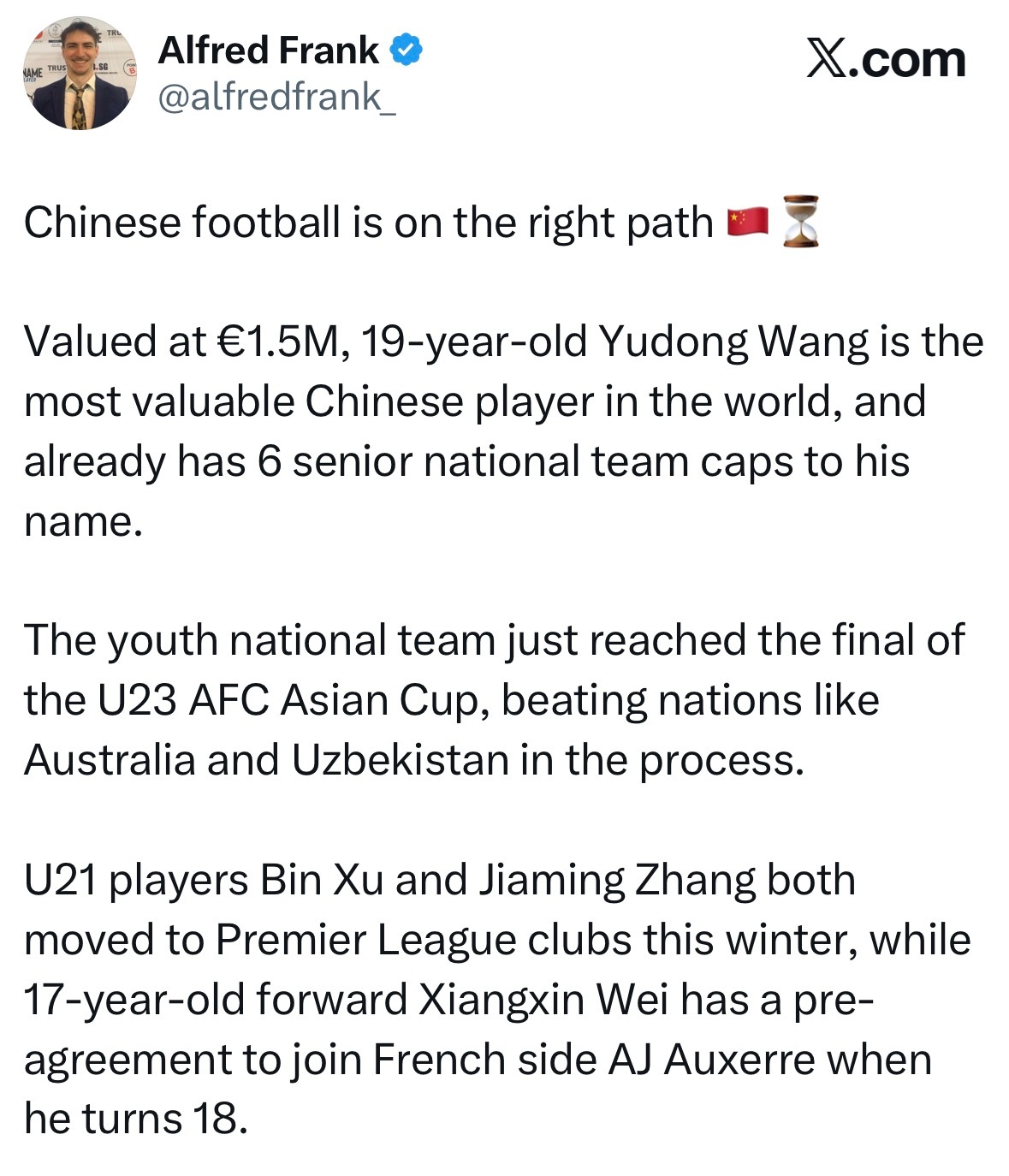 欧洲球探平台Eyefootball发了一个看好中国足球青训的帖子,虽然不是啥大平台,但是大过年的看看也挺让人高兴的,转发了————————中国足球正走在正确的道路上 🇨🇳⏳身价150万欧元的19岁球员王钰栋,是目前全球身价最高的中国球员,并且已经代表成年国家队出战6次。国青队刚刚闯入U23亚洲杯决赛,期间击败了澳大利亚、乌兹别克斯坦等强队。U21球员徐彬、张嘉明今年冬天双双加盟英超俱乐部,而17岁前锋韦向欣则已达成预协议,年满18岁后将加盟法国欧塞尔俱乐部。中国青年足球显然正在崛起,中国足协公布的数据从青训和基层层面提供了有力支撑:• 业余赛事数量增长 +140%• 业余球员数量增长 +95%• 注册青年球员增长 +25%• 参赛球队数量增长 +27%我一直坚信,投入青训是中国足球发展的出路,而这些数据正是投入后的成果。我们是否正站在中国成为足球强国的前夜?