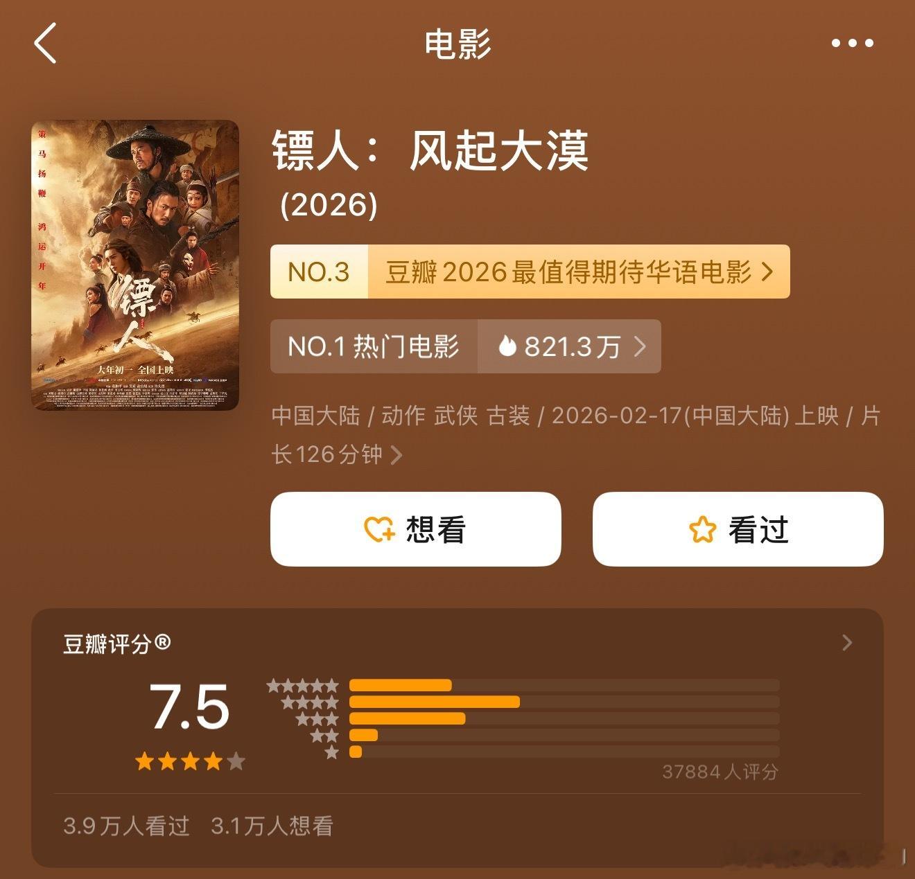 春节档电影已有三部率先豆瓣开分:《飞驰人生3》7.6分《镖人》7.5分《星河入梦》7.0分