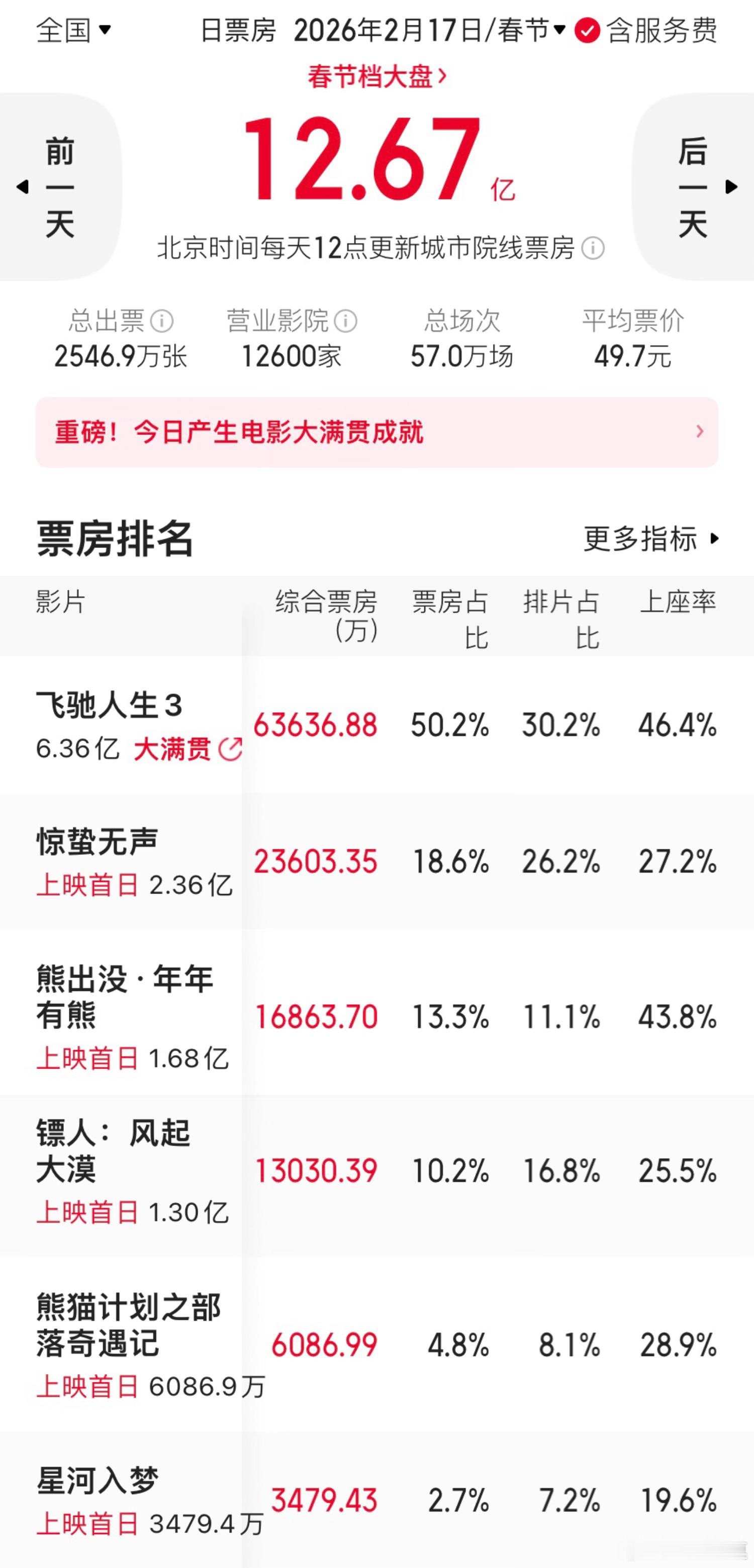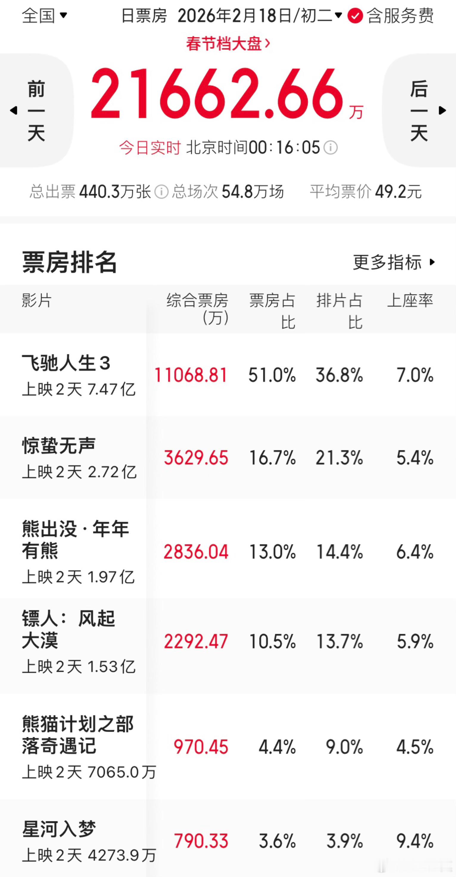 《飞驰人生3》36.8%,+6.6%《惊蛰无声》21.3%,—4.9%《熊出没》14.4%,+3.3%%《镖人》13.7%,—3.1%《熊猫计划》9.0%,+0.9%《星河入梦》3.9%,—3.3%
