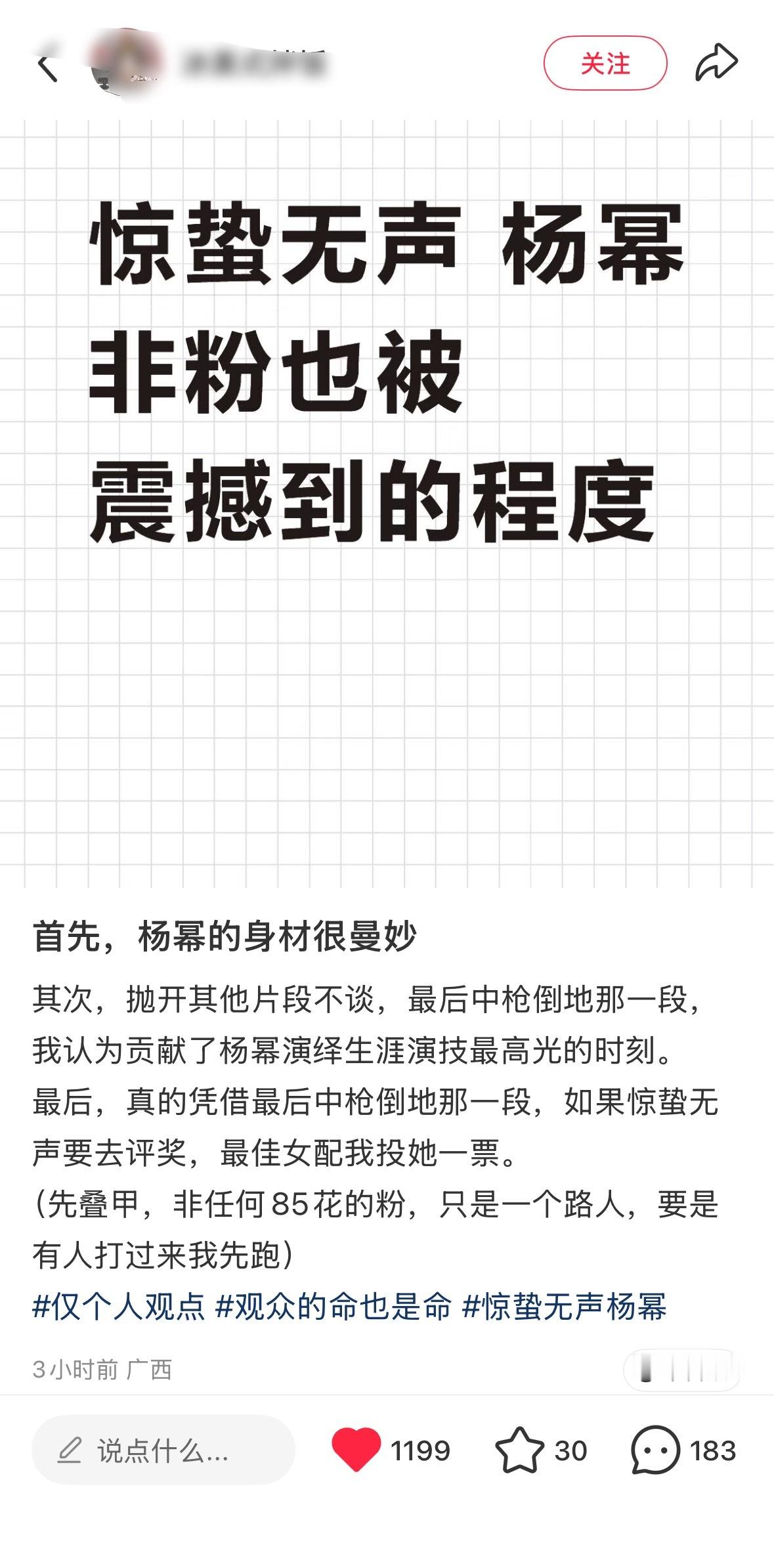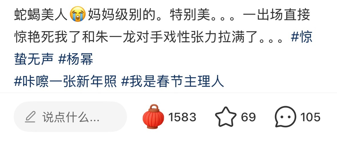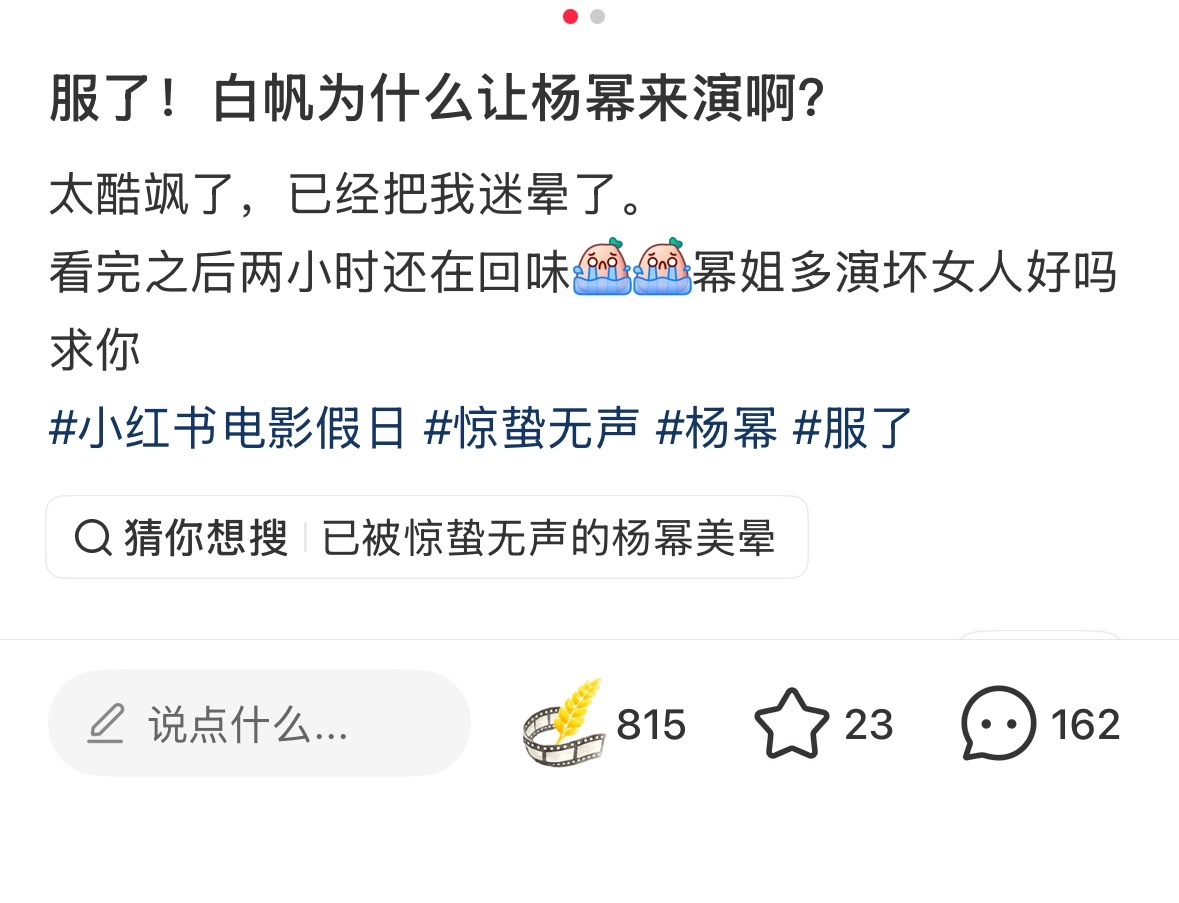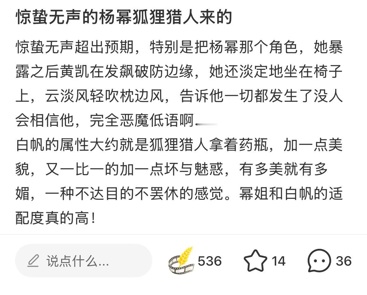 惊蛰无声 第一天观众看完后,杨幂白帆 的好评涌现,我就这样爽点赞爽截图狐狸猎人、张力拉满、杨幂把我迷晕了、淡淡的疯感抽象又带劲、美丽毒玫瑰、演技派、表演细腻扎实、身材很曼妙……路人都太会形容太会夸赞了,“杨幂演特务还是太权威了” 还上了地瓜热榜!🔥