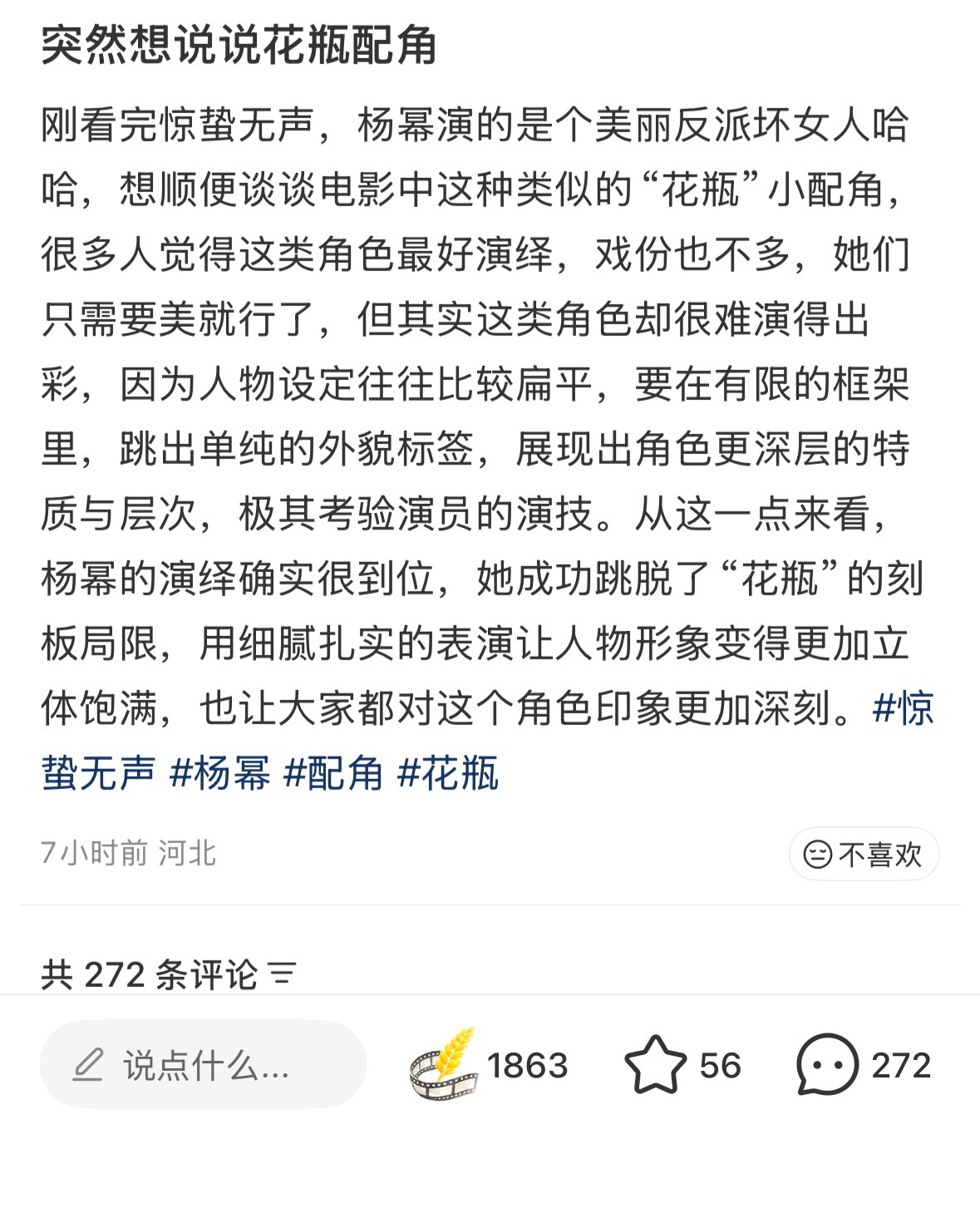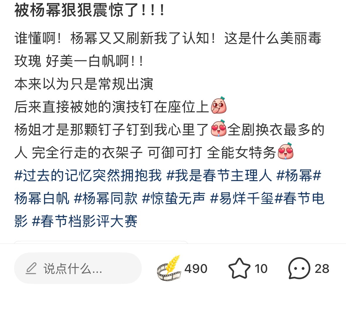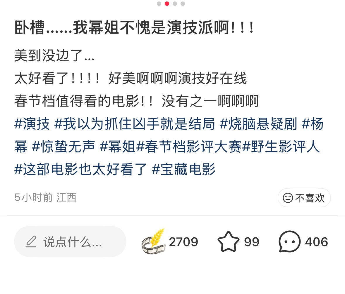 惊蛰无声 第一天观众看完后,杨幂白帆 的好评涌现,我就这样爽点赞爽截图狐狸猎人、张力拉满、杨幂把我迷晕了、淡淡的疯感抽象又带劲、美丽毒玫瑰、演技派、表演细腻扎实、身材很曼妙……路人都太会形容太会夸赞了,“杨幂演特务还是太权威了” 还上了地瓜热榜!🔥