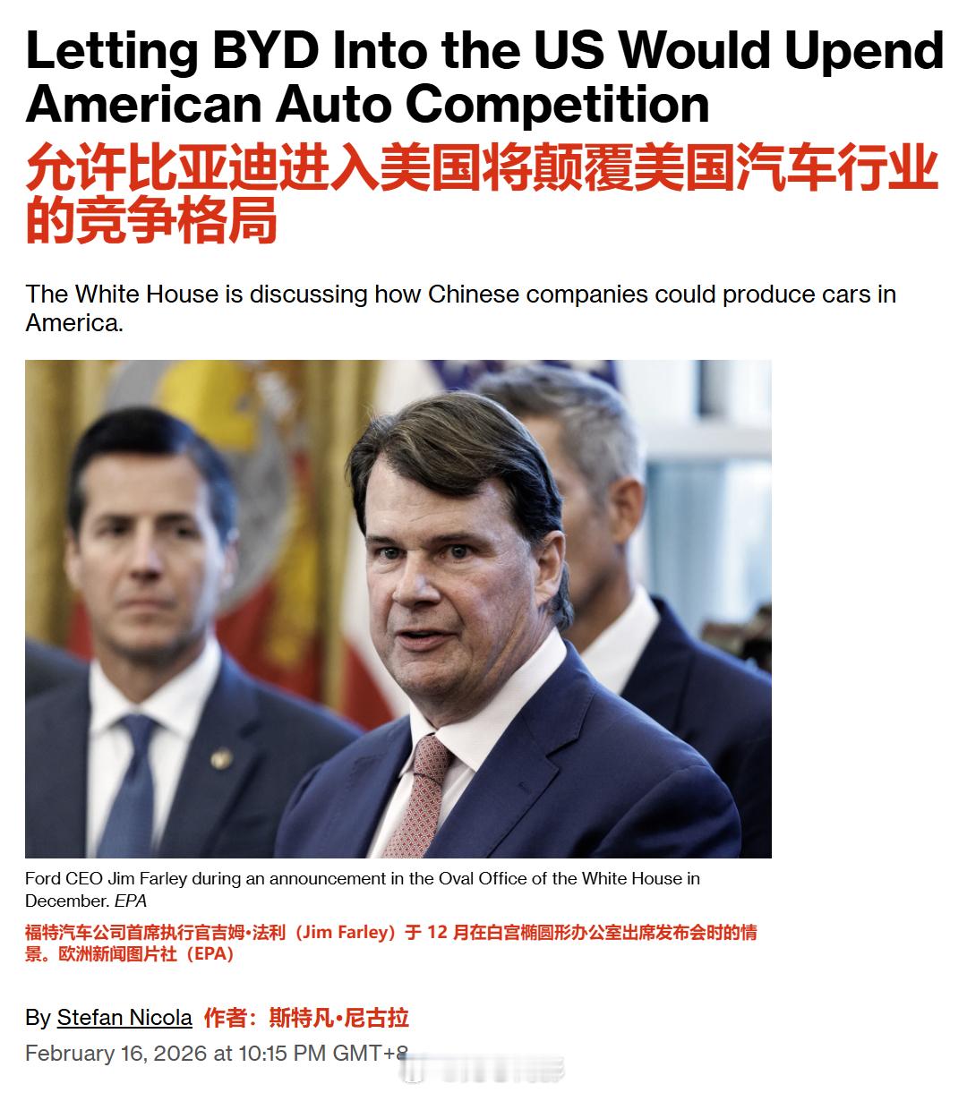 报道称,福特汽车首席执行官吉姆·法利(Jim Farley)曾与白宫探讨一种潜在框架:中国车企可通过与本土竞争对手组建合资企业的方式,在美国本土生产汽车。这一模式对中国车企而言并不陌生,因其在国内早已广泛应用。