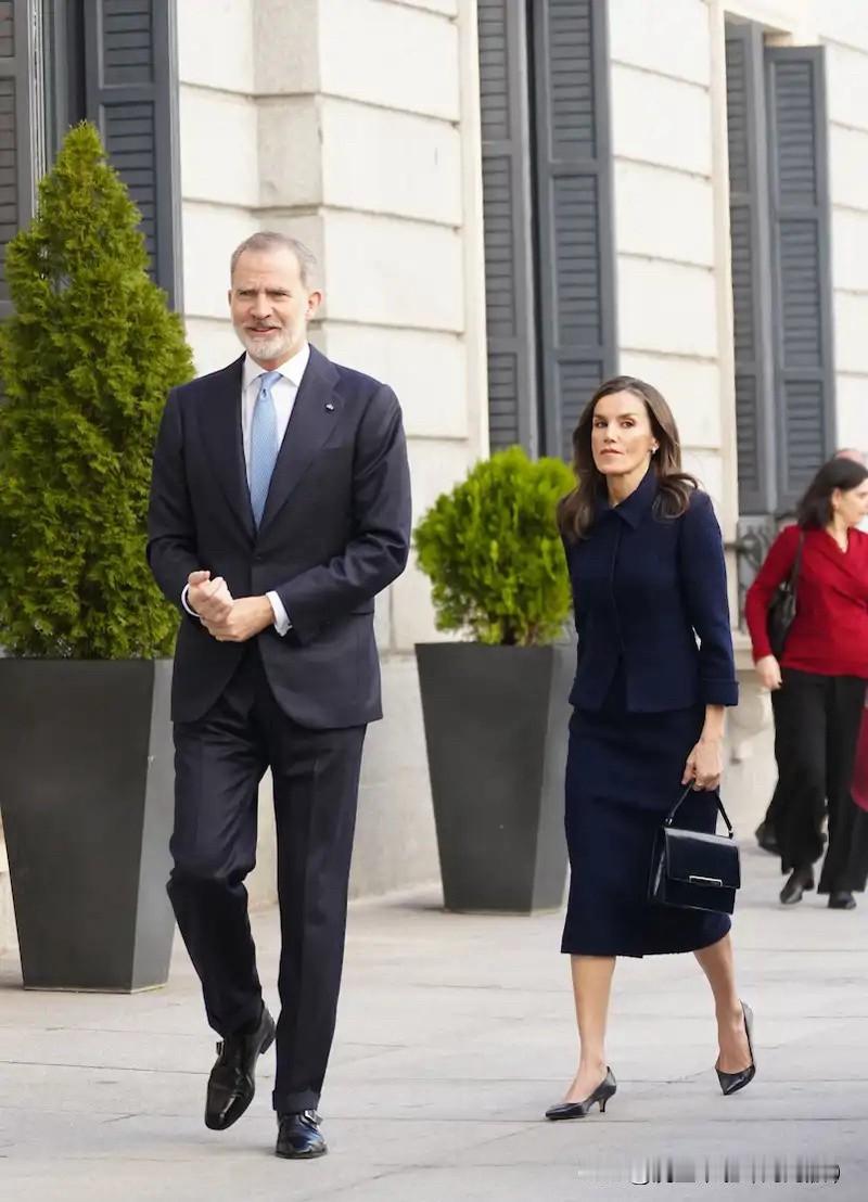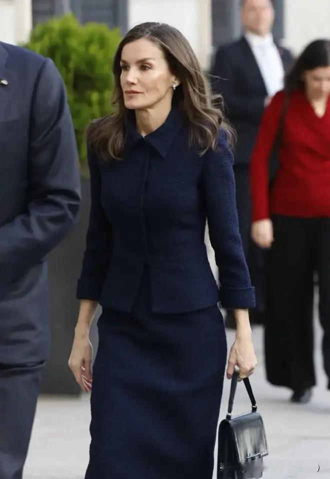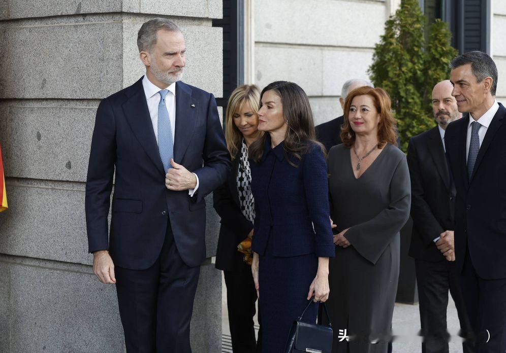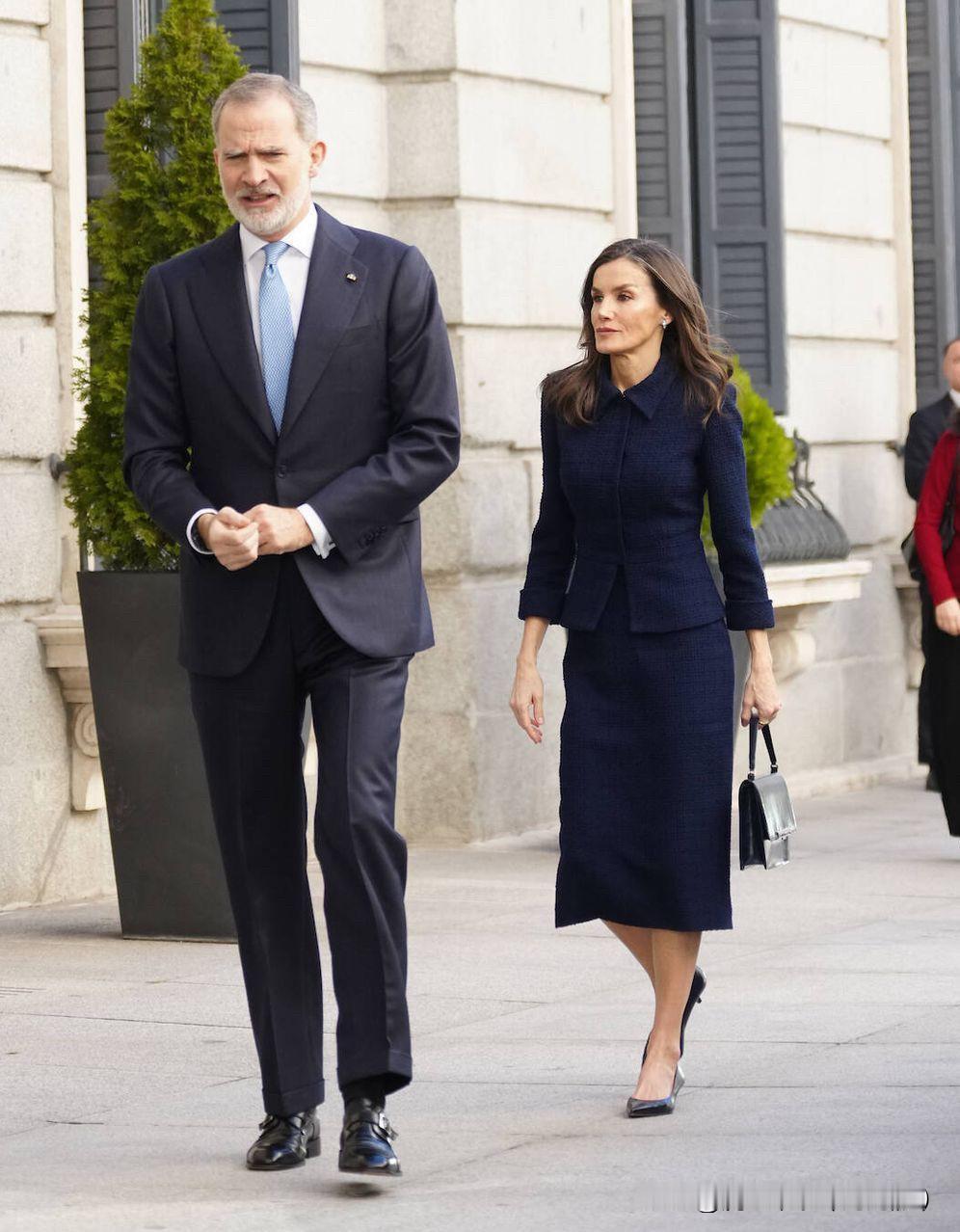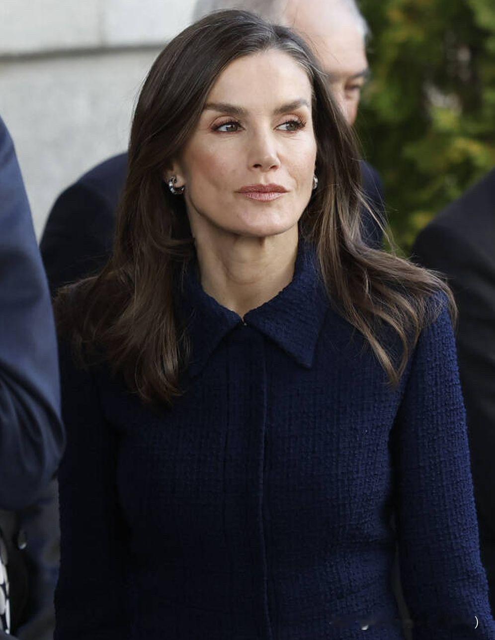 国王夫妇主持召开宪法颁布47周年纪念活动!莱蒂齐亚的海军蓝粗花呢子套裙非常职业,搭配了同色系钻石耳环,整体造型干练精致!
