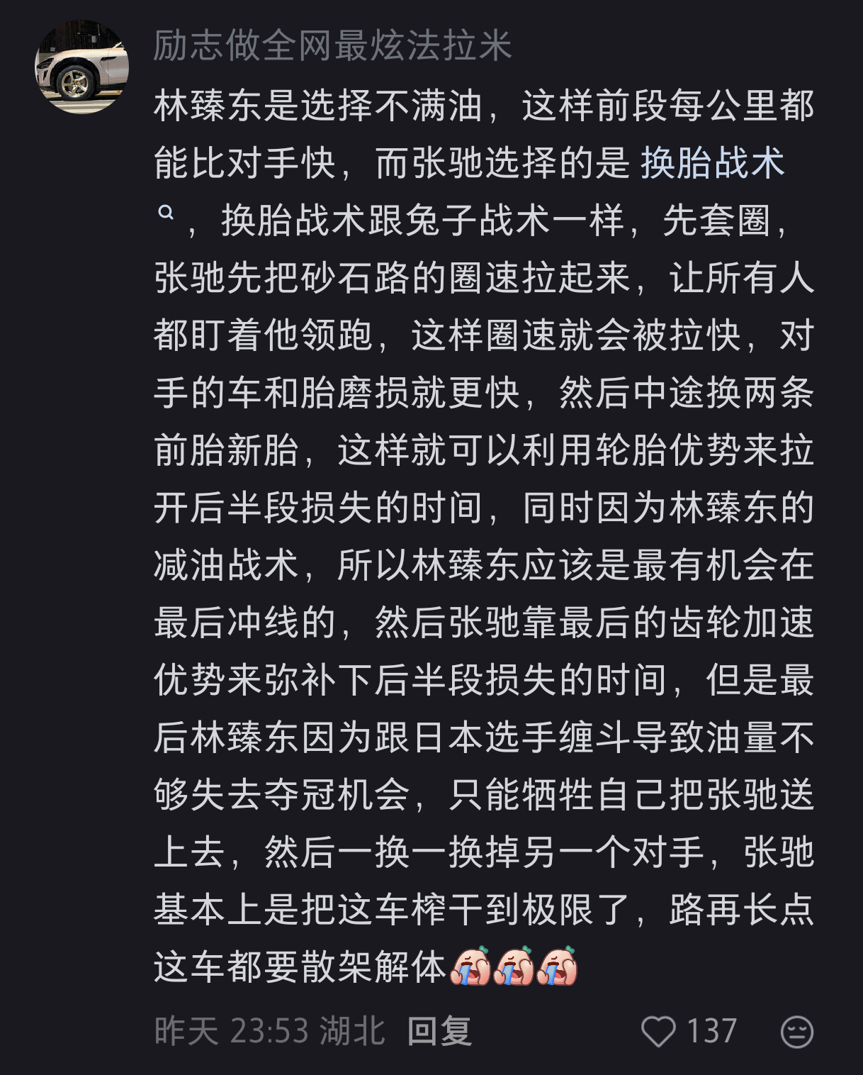 《飞驰人生3》决赛时林臻东和张驰作为最后增补的个人车手,按照规则是最后发车,且比其他大公司车队的车手少两次增压加速的机会,他俩必须有战术配合才能最终保一个人去夺冠!他俩的惺惺相惜就在于都很认可对方的实力,都替对方担心希望为对方分担一些压力,因此都付出了计划外的努力,损失了自己的夺冠希望,最后又都想燃尽自己去成全对方!是一种赛场上的【与子同袍】的感动