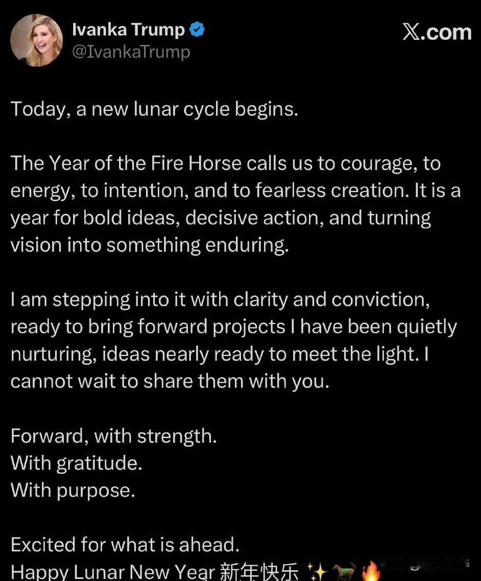 伊万卡Ivanka春节祝福 今天,一个新的月球周期开始了。 火马年呼唤我们勇气、活力、意图和无畏的创造。今年是大胆的想法、果断的行动和将愿景转化为持久的东西的一年。 我带着清晰和坚定的信念踏入其中,准备提出我一直在默默培育的项目,想法几乎准备好迎接光明。我迫不及待地想和你分享。 前进,有力量。怀着感激之情。有目的。 对未来感到兴奋。农历新年快乐