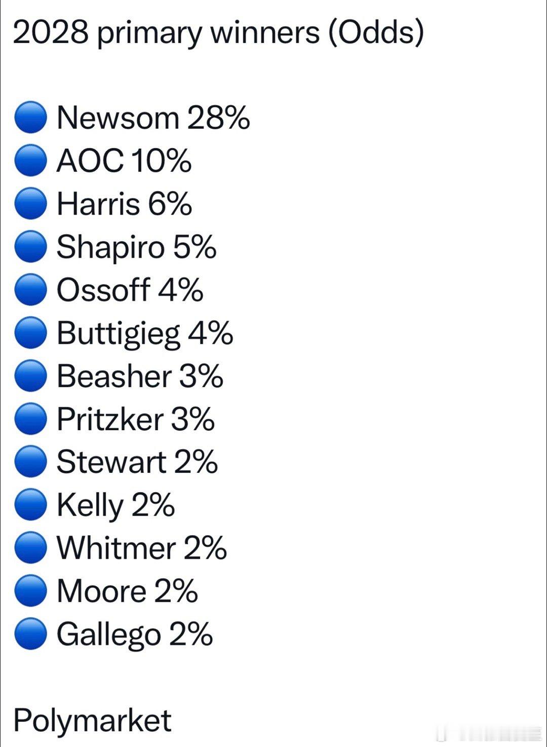目前2028民主党内初选阶段的竞争,看好Newsom 的最多,AOC其次
