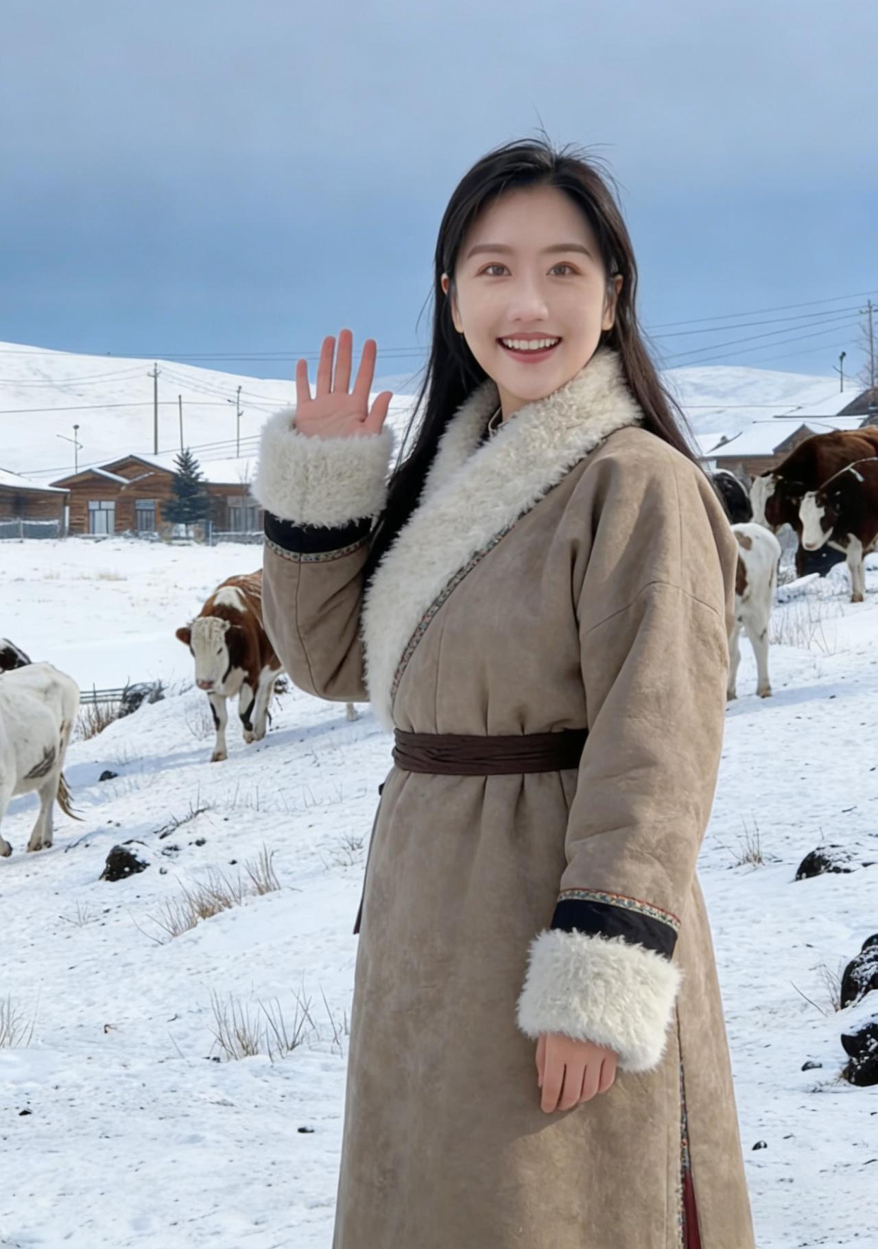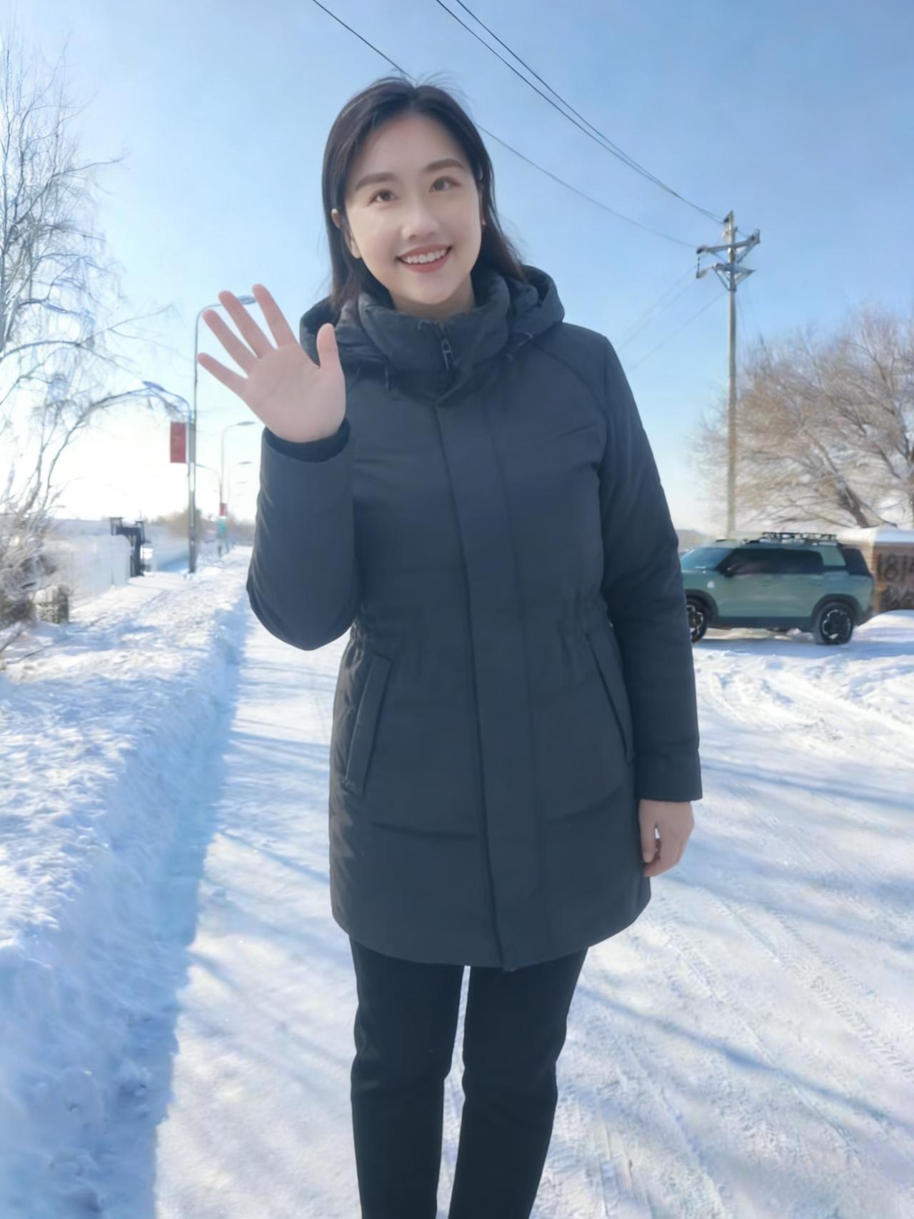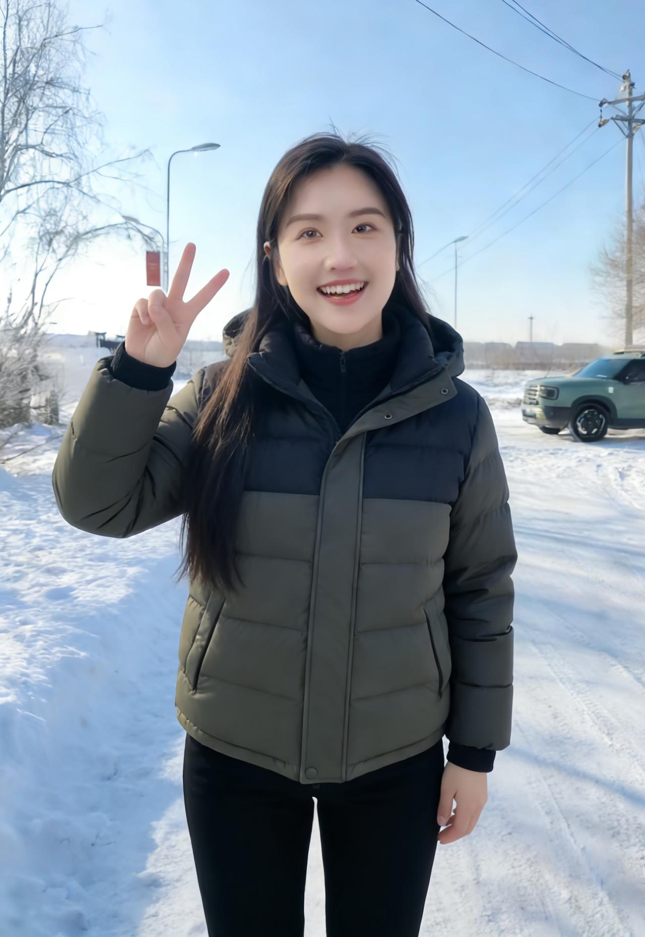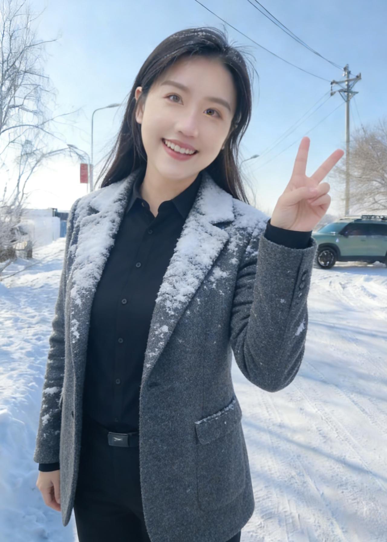 不必借梅的艳,也不必仿松的挺 她站在雪地里,便是冬日的绝色本身 眉眼弯时,寒云便散了几分 唇角扬时,冰雪便融了几分 ~ 黑长发披在肩后,沾着雪的微凉 却衬得肤色如玉,比雪更莹润 你的浅笑,藏着江南的温婉 米色绒衣裹着的,是不熄的暖 你的挥手,带着塞北的爽朗 麂皮长衣的纹路,织着旷野的风 ~ 她穿黑羽绒时,像暗夜里的灯 指尖比出的V字,是破寒的勇气 雪落在她的肩头,不似负重 倒像为她缀上的银饰,添了几分灵动 灰西装沾雪时,又添了几分利落 职场的干练与冬日的柔软,撞出别样风情 ~ 夕阳吻过她的侧脸,把轮廓描得温柔 金辉淌在她的颈间,细链闪着微光 她不说话,只是站着 便让雪的冷,有了人的温度 让冬的寂,有了春的期许 她的眼波里,盛着雪后的晴空 盛着溪流的欢歌,盛着牛群的悠闲 盛着一个人,对冬日最赤诚的热爱 原来美人之美,从不在衣饰的更迭 而在她眼底的光,能把寒冬 都照亮成,最明媚的模样