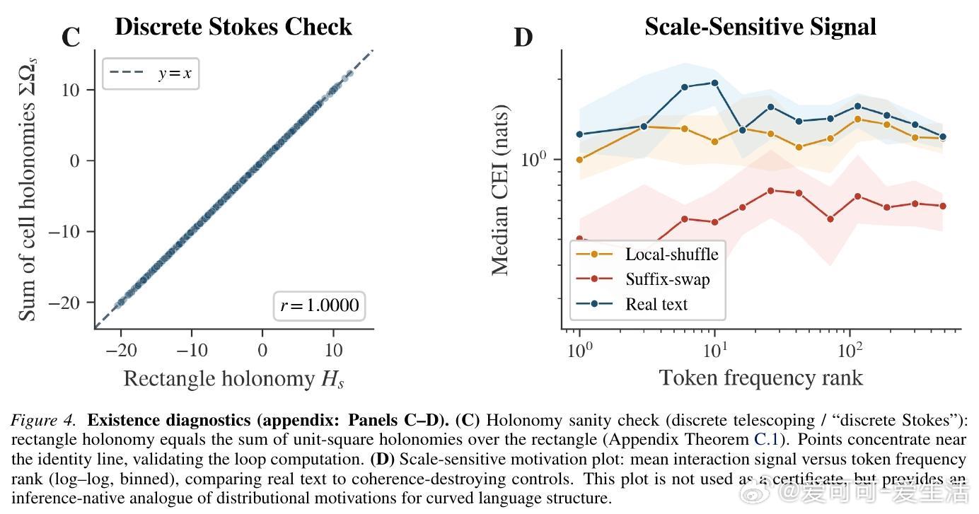 - 完整性验证(Holonomy):在平坦空间中,证据更新的顺序不应影响结果。但在自然语言中,先看左边再看右边,与先看右边再看左边的逻辑感知是完全不同的。- 证据加性验证(CEI):如果文本是平坦的,左右上下文对语义的贡献应该是简单的对数加法(Product-of-Experts)。实验发现,自然文本严重违反了这种加性,而随机打乱的文本则会回归平坦。