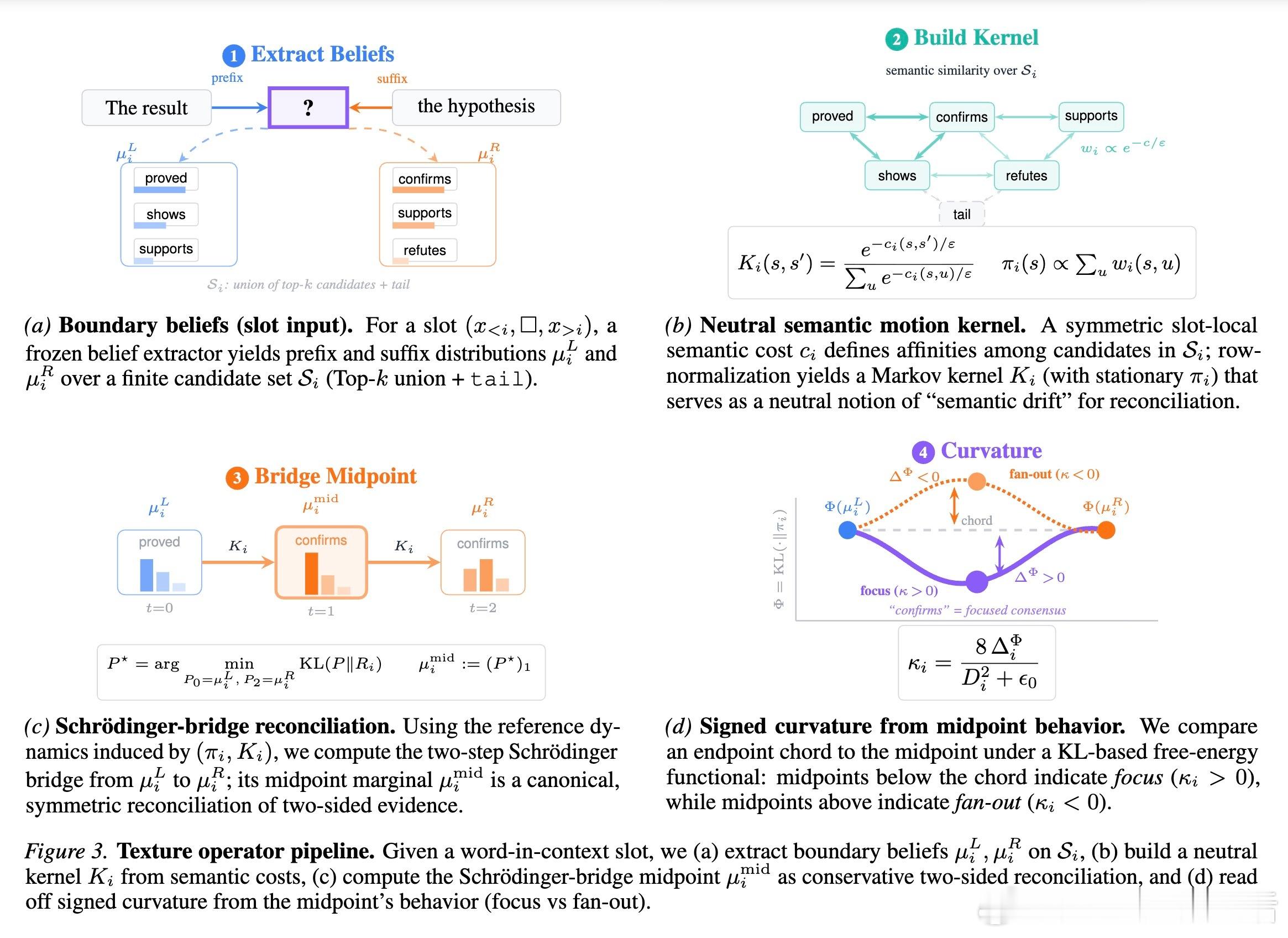研究者引入了 Texture 这一概念来量化这种曲率。通过“薛定谔桥”(Schrödinger Bridge)算法,他们寻找左右信念在中间相遇时的最平滑路径: