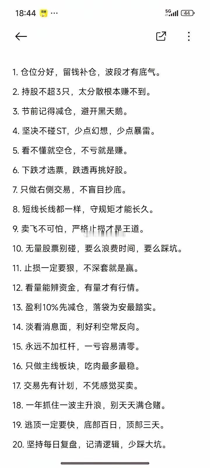 股市里最高境界是什么 1. 仓位分好,留钱补仓,波段才有底气。2. 持股不超3只,太分散根本赚不到。3. 节前记得减仓,避开黑天鹅。4. 坚决不碰ST,少点幻想,少点暴雷。5. 看不懂就空仓,不亏就是赚。6. 下跌才选票,跌透再挑好股。7. 只做右侧交易,不盲目抄底。8. 短线长线都一样,守规矩才能长久。9. 卖飞不可怕,严格止损才是王道。10. 无量股票别碰,要么浪费时间,要么踩坑。11. 止损一定要狠,不深套就是赢。12. 看量能辨资金,有量才有行情。13. 盈利10%先减仓,落袋为安最踏实。14. 淡看消息面,利好利空常反向。15. 永远不加杠杆,一亏容易清零。16. 只做主线板块,吃肉最多最稳。17. 交易先有计划,不凭感觉买卖。18. 一年抓住一波主升浪,别天天满仓赌。19. 逃顶一定要快,底部百日,顶部三天。20. 坚持每日复盘,记清逻辑,少踩大坑。干货分享股票投资小技巧股市法则股票投资思维 投资有风险,投资需谨慎