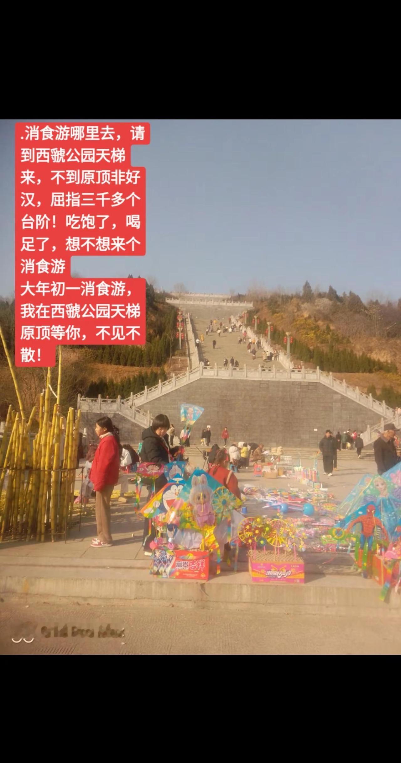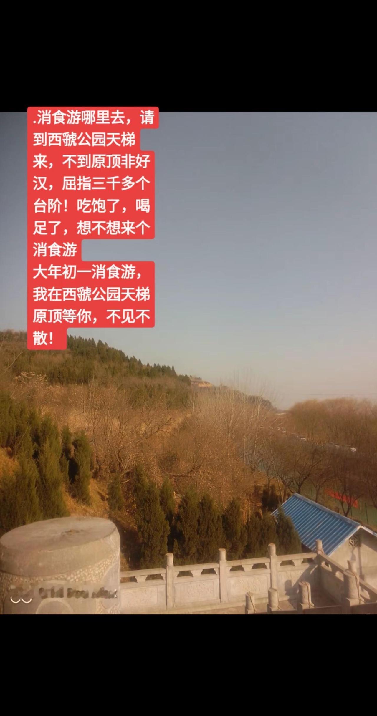.消食游哪里去,请到西虢公园天梯来,不到原顶非好汉,屈指三千多个台阶!吃饱了,喝足了,想不想来个消食游大年初一消食游,我在西虢公园天梯原顶等你,不见不散!