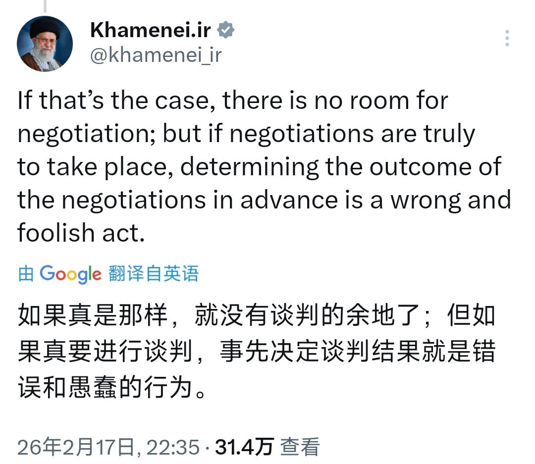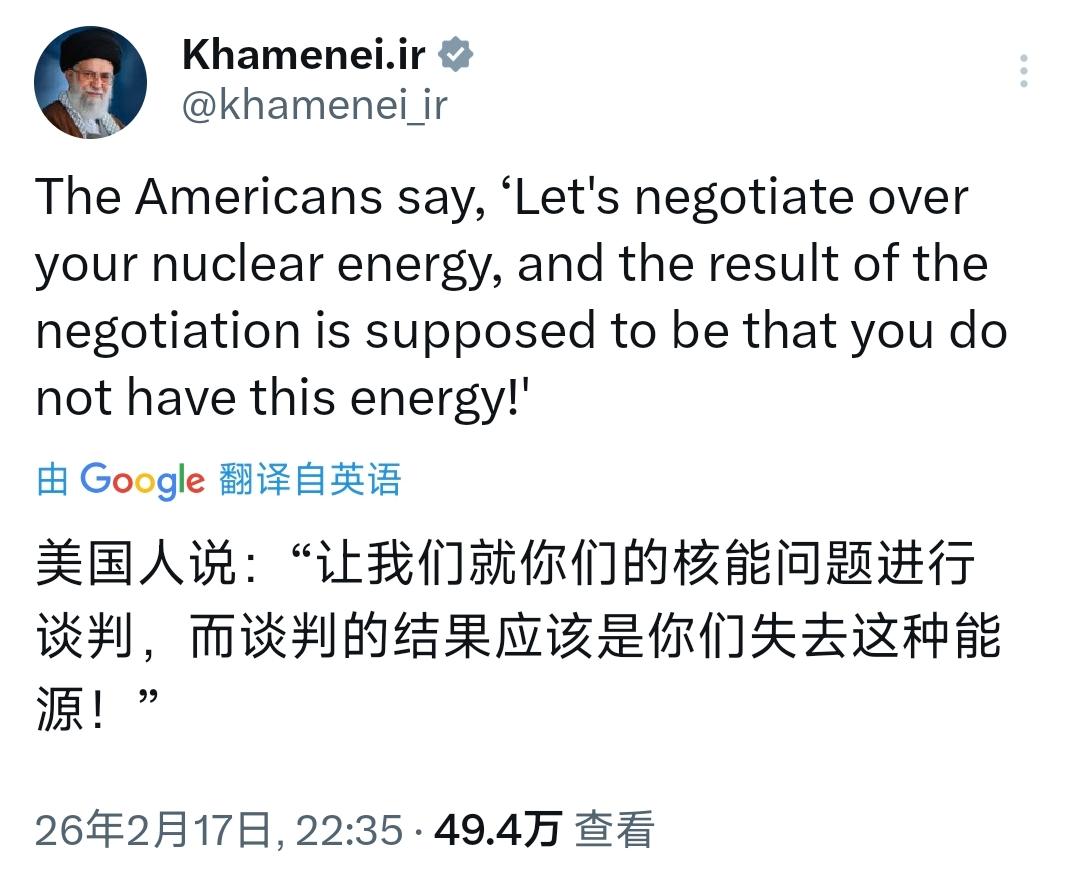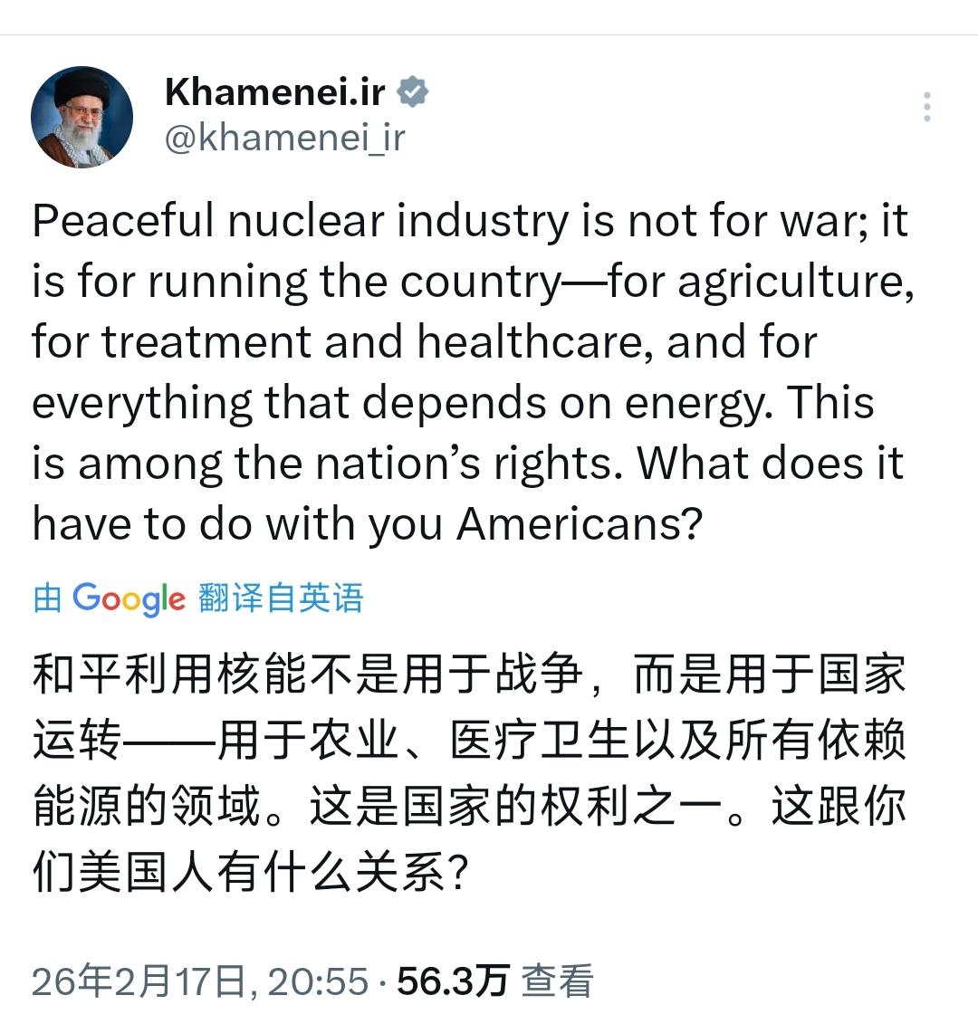 伊朗最高领袖哈梅内伊昨晚(北京时间2月17日晚)连发四条文字:“核能是我们不可剥夺的权利,这一点也已写入国际原子能机构的准则。也就是说,所有国家都有权拥有核设施和浓缩铀设施。这是国家权利之一。美国为什么要干涉?! 和平利用核能不是用于战争,而是用于国家运转用于农业,医疗卫生以及所有依赖能源的领域。这是国家的权利之一。这跟你们美国人有什么关系? 美国人说:‘让我们就你们的核能问题进行谈判,而谈判的结果应该是你们失去这种能源!’ 如果真是那样,就没有谈判的余地了;但如果真要进行谈判,事先决定谈判结果就是错误和愚蠢的行为。” [机智]评几句:当今国际社会本质还是弱肉强食的丛林世界,规则由强者制定、弱者买单。虽然哈梅内伊连发狠话,坚称和平核能是伊朗不可剥夺的权利,怒斥美国无权干涉、更不能预设谈判结果,看似寸步不让,实则暗藏让步空间——面对特朗普要求交出武器级浓缩铀的强硬条件,伊朗可能已不再死守全部底线,而是用强硬表态守住体面、为谈判留有余地。美国以霸权逻辑肆意剥夺主权国家合法权利,把国际公约当废纸,但是伊朗再强硬也难敌强权施压,这场博弈赤裸裸证明:没有实力做后盾,再多看似正义的呐喊,在丛林法则面前都显得苍白无力。