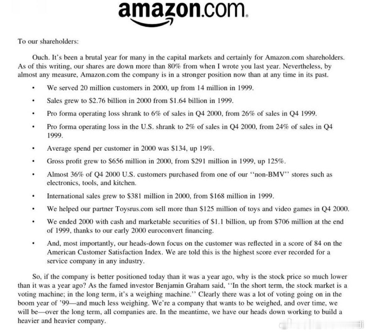 亚马逊股价在2000年暴跌了80%。以下是杰夫·贝佐斯当时对投资者说的话:——————Amazon.com致股东信致我们的股东:哎呀。对资本市场中的许多人来说,当然也对亚马逊的股东来说,这是残酷的一年。截至撰写本文时,我们的股价较去年我给大家写信时下跌了超过80%。然而,从几乎任何标准衡量,亚马逊公司如今的处境都比以往任何时候都更加稳固。- 2000年,我们服务了2000万客户,高于1999年的1400万。- 销售额从1999年的16.4亿美元增长到2000年的27.6亿美元。- 2000年第四季度,预计经营亏损占销售额的比例从1999年第四季度的26%降至6%。- 2000年第四季度,美国地区的预计经营亏损占销售额的比例从1999年第四季度的24%降至2%。- 2000年,每位客户的平均消费额为134美元,同比增长19%。- 毛利润从1999年的2.91亿美元增长到2000年的6.56亿美元,增幅达125%。- 在2000年第四季度,近36%的美国客户从我们的“非图书、音乐和视频”商店之一购买了商品,例如电子产品、工具和厨房用品。- 国际销售额从1999年的1.68亿美元增长到2000年的3.81亿美元。- 2000年第四季度,我们帮助合作伙伴Toysrus.com销售了超过1.25亿美元的玩具和视频游戏。- 得益于2000年初的欧元转换融资,我们在2000年末拥有11亿美元的现金和有价证券,高于1999年末的7.06亿美元。- 最重要的是,我们对客户的埋头专注体现在美国客户满意度指数84分的得分上。我们得知,这是所有行业中服务公司有史以来的最高得分。那么,如果公司如今的处境比一年前更好,为什么股价比一年前低这么多呢?正如著名投资者本杰明·格雷厄姆所说:“短期来看,股市是一台投票机;长期来看,它是一台称重机。”显然,在1999年的繁荣年里,有很多“投票”在进行——而“称重”则少得多。我们是一家希望被“称重”的公司,随着时间的推移,我们也会被“称重”——从长远来看,所有公司都是如此。与此同时,我们正埋头苦干,致力于打造一家越来越有分量的公司。 ————————贝索斯是华尔街出来的,当时在大卫肖的量化基金工作,不出来也能有不错的成就,当然出来更厉害无数倍,这封信很有价值投资的口吻,可惜巴菲特曾经投资过亚马逊,没拿住 深圳·不藏咖啡