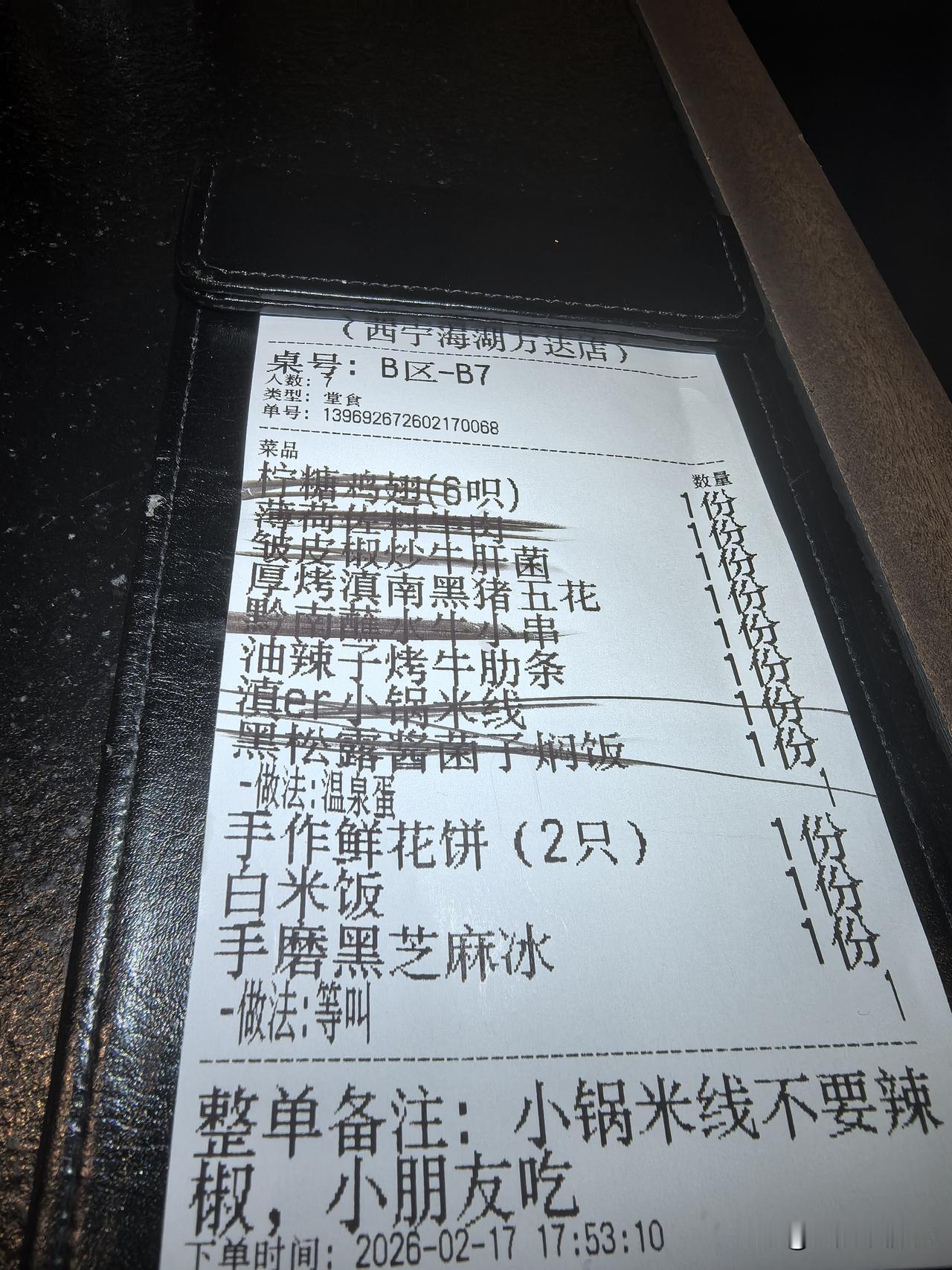 大年初一,我在西宁海湖万达“下馆子”! 初一去给老丈人拜年,一大家子从中午12点吃到下午3点多。席间还和两个小辈开了瓶珍藏了15年的红牌汾酒,不知不觉就见了底。下午5点多出门,外孙女嚷着要去公园,一看天冷得厉害,干脆一家人转战万达——逛商场、坐小火车,热热闹闹地消磨时间。 儿子儿媳带着孙女、外孙女两个小家伙一直玩到6点多,我们便找了家云南风味的馆子解决晚饭。点了七八样菜,本以为能尝点新鲜,结果一口下去,辣得眼泪直打转,只能硬着头皮边喝水边吃。 菜品还真挺丰盛的:柠糖鸡翅、薄荷佐料牛肉、皱皮椒炒牛肝菌、厚烤滇南黑猪五花肉、油辣子烤牛肋条、黑松露酱菌子焖饭……给小朋友特意点了手作鲜花饼、白米饭、手磨黑芝麻冰,还有一碗滇Er小锅米线。 原本说好这顿我请,结果儿子儿媳和女儿抢着下单,我愣是没插上手。最后这顿饭到底花了多少钱,我也没好意思问。 友友们,你们给估个价,这桌菜得花多少钱? 海湖万达店 记录我的2026