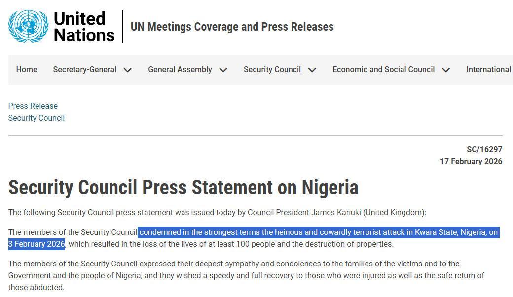 #尼日利亚发生恐袭安理会发声#【尼日利亚发生恐袭致超百人死亡 安理会:以最强烈措辞谴责】本月3日,尼日利亚夸拉州卡亚马地方政府辖区两个村落遭遇武装分子袭击,导致超过百人死亡。尼日利亚政府随后认定该起事件为恐怖主义袭击。尼总统提努布则下令向事发地部署军队。在2月17日,联合国安理会发表新闻声明,以最强烈措辞谴责这一恐袭事件。