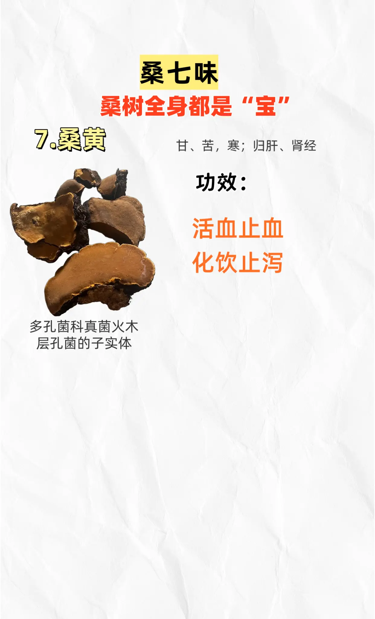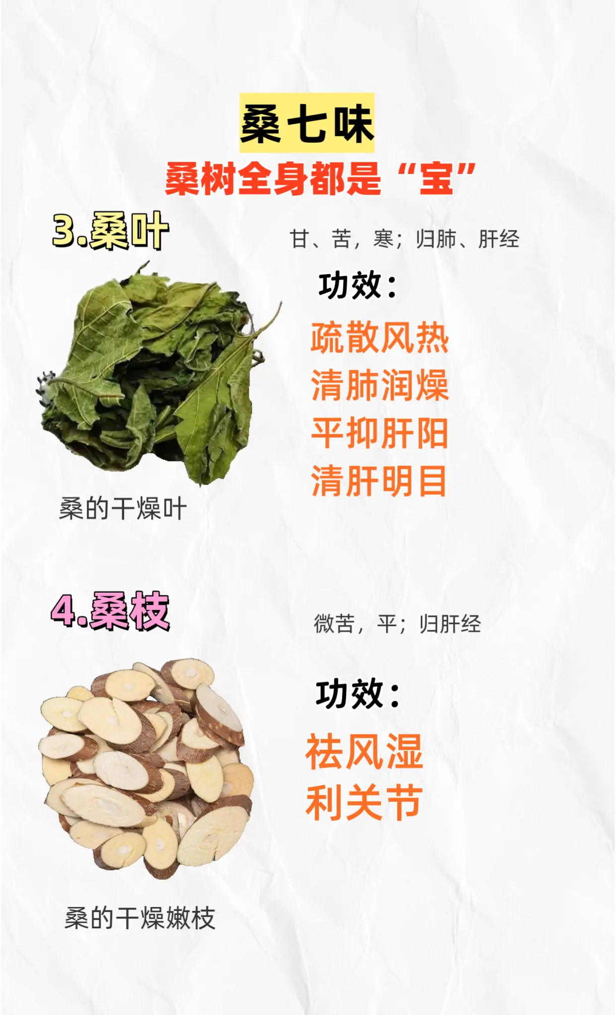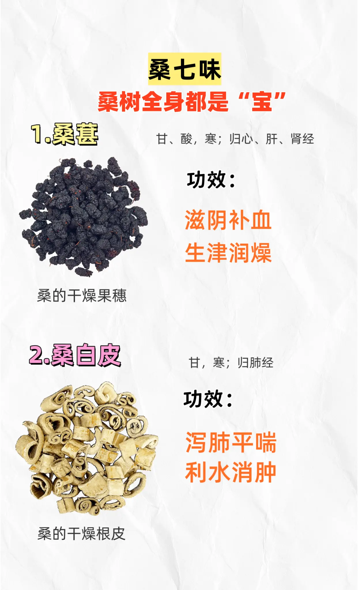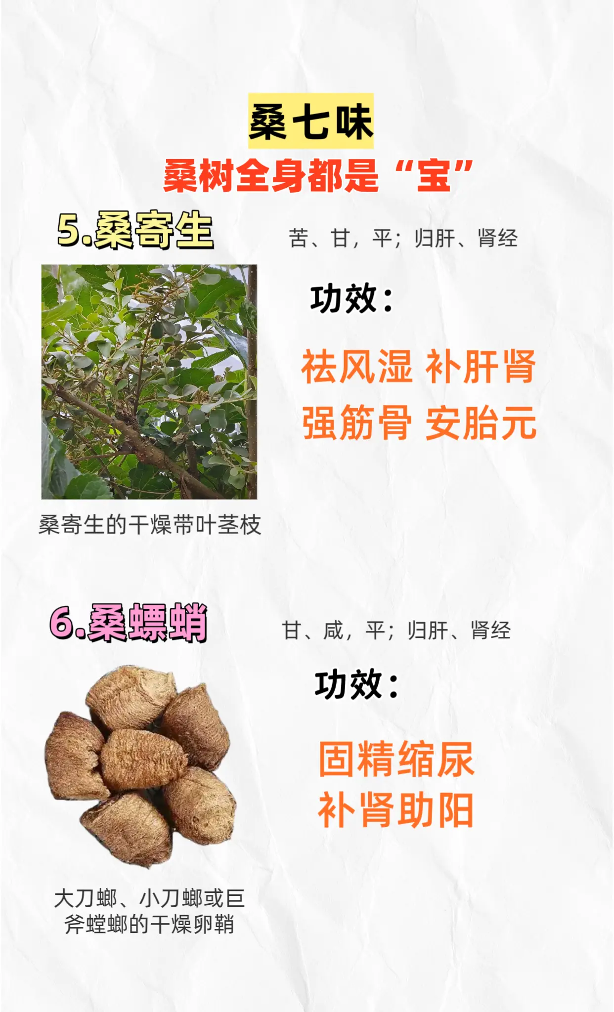 桑树全身都是宝。桑七味:桑葚桑白皮桑叶桑枝桑寄生桑螵蛸桑黄