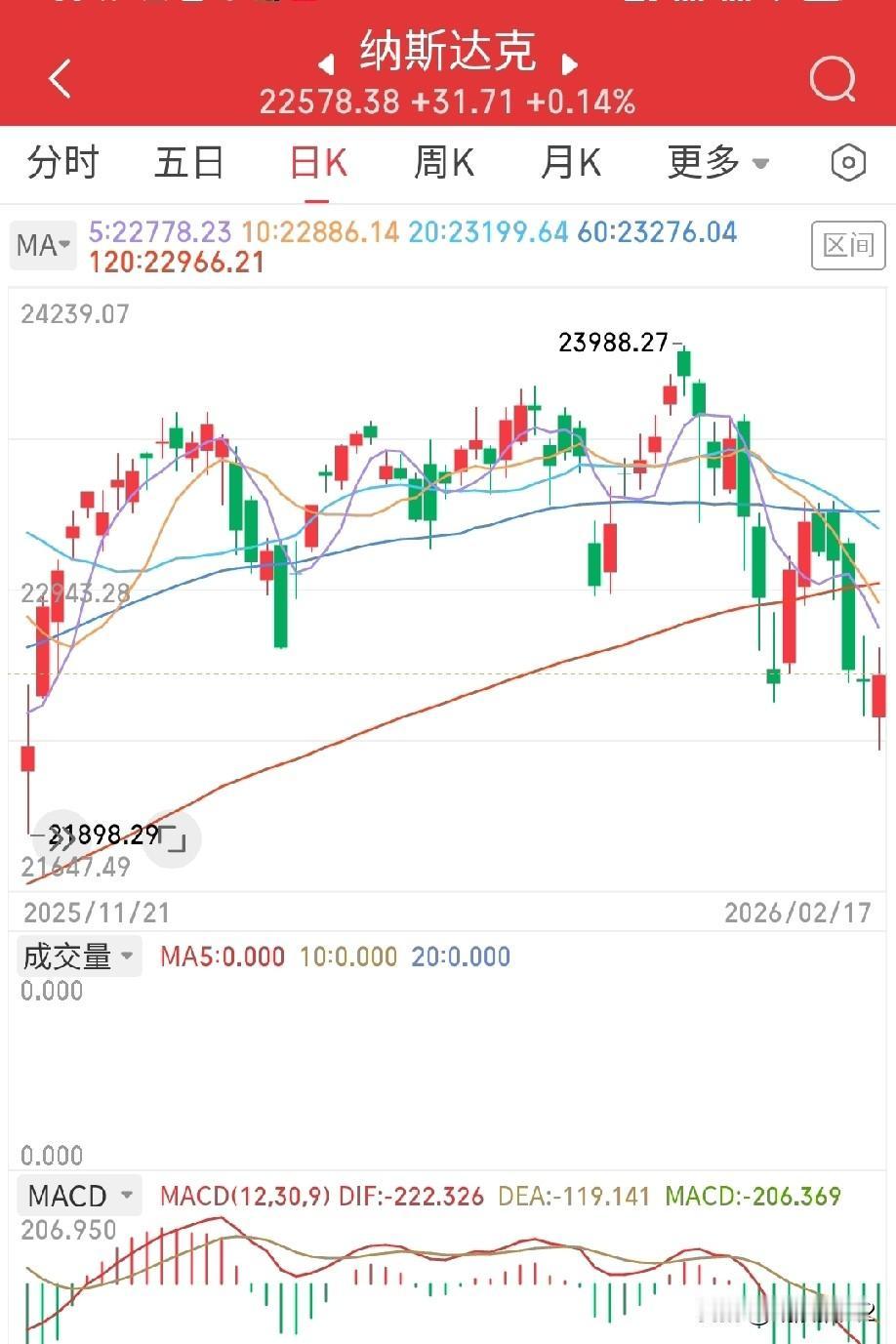 2月18日早评。很多人认为节假日期间欧美股市又要搞偷袭,恶心我们。但是,没有!昨晚美股三大指数均出现低开,最后勉强收出红十字星(图1):它们自己也玩不动了。 大家知道现在美股和A股有什么共同特征么?那就是老登股的走势明显强于科技股,大家对比一下道指和纳指的K线走势就明白了(图2、3)。事实就是如此,很多华尔街投行正在出清科技股,大部分资金要么流向海外市场,要么转投工业股,否则干脆持币不动、现金为王。 美科技股的神话,可能要被打破了!最直观的原因有两个: 一个是市场已把科技企业的盈利预期炒到了顶,很多公司被市场资金逼到没有容错率的绝境,只要公司有一点点不及预期的东西,股价马上出现大波动,风险已经很大; 二是中国替代击中了美科技股的要害,不要看美股七朵金花的市盈率并不是太高,但是从技术潜能、市场份额、现金流和盈利预期等多方面分析,它们正在失去叙事逻辑。不知道哪一天,它们非但失去中国市场,而且会被白菜价的中国产品抢占全球其它市场份额。中美科技看着还有一段距离,但是这点距离在中国列车超高速前进的情况下,并驾齐驱或超越可能就是一瞬间的事。全世界都看明白了! 节后,A股的科技方向有两个:机器人概念和SeeDance2.0概念。尽管昨天有小道消息说后者因涉及法律、道德上虚构和伪证的问题被停止推广应用,但至少在我毗陵猎人手机上的App应用商店里没见到下架。无论如何,这两个板块在科技领域大段位的技术提升和突破决定它们大概率会是节后市场的阶段性主题。 最后顺便提一下贵金属,昨天COMEX金银价格大跌,一场由华尔街资金精心设计的贵金属之局,也许正在收网。毗陵猎人从一个月前就开始建议大家不要去碰它们了。 个人观点,不构成投资依据,不喜勿喷。祝大家节日快乐!