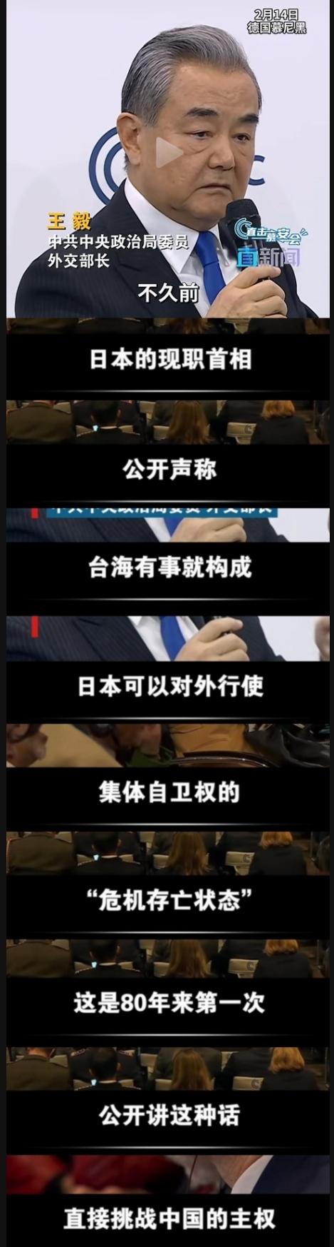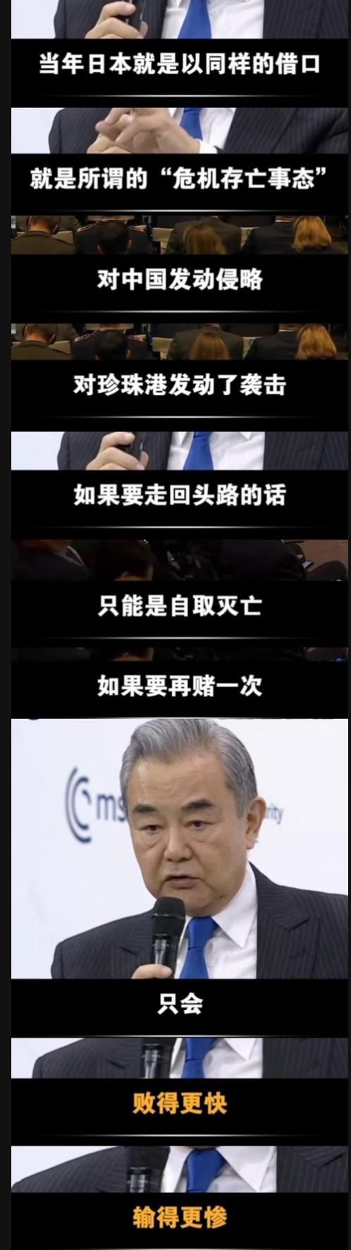 对于王毅外长在慕尼黑安全会议上的讲话(图2、3、4),日本向我方提出抗议和交涉,这是继日本对我驻大阪总领事薛剑因高市早苗恶劣言论说出“砍掉它肮脏的头颅”后提出抗议和交涉后的最新一次抗议和交涉。 我驻日本大使馆用反问驳回日本无理狡辩的抗议和交涉。但是我们想问的是,日本明知中国说的没错为什么还要提出抗议和交涉?这是因为日本已经被美西方国家惯坏了。如果我们留意过就会注意到一个现象,那就是包括美国在内的美西方国家一般轻易不会、也不敢对日本说错的话、做错的事提出异议和谴责,哪怕就算是日本真的得罪了自己的国家也不会,究其原因,还是二战时日本对西方国家,比如对英国、新西兰的战俘进行过的残暴的虐待,已经让他们对日本有了惧怕的记忆,而日本恰恰也因此把中国当成了美西方国家,并认为中国能像美西方国家那样把它当回事地接受它们的抗议和交涉。 但在中国人心里完全相反,除了觉得日本欠中国很多——事实也是如此,所以别说是谴责,就是给它一个嘴巴也得给我受着才对。 但这不是全部,在中国人心中对日本还存在着一种说不出来的非常窝囊的感觉,那就是在国土面积、人口数量等各方面跟中国都不存在可比性的日本,为什么能侵略我们、屠杀我同胞,敢犯下罄竹难书的罪行?这种无法释怀的感觉,每当在日本用它们惯用的狡辩对我进行冒犯时都会被激活并迅速放大到它本该有的程度。而日本完全无视中国人民的这种感觉,还在以此为乐地让中国人民的这种感觉积攒的越来越多。 现在可以肯定,由自信以及好赌组成的“军国主义阴魂不散”的日本现在正犯下不亚于对中国侵略的战略错误,它终将会用它们愚蠢的“存亡危机状态”把中国人民心中的窝囊气用报仇雪恨的方式对日本释放出来,其结果就是它“败得更快,输得更惨”。而日本正在用它们最擅长的豪赌不遗余力地促成此事。