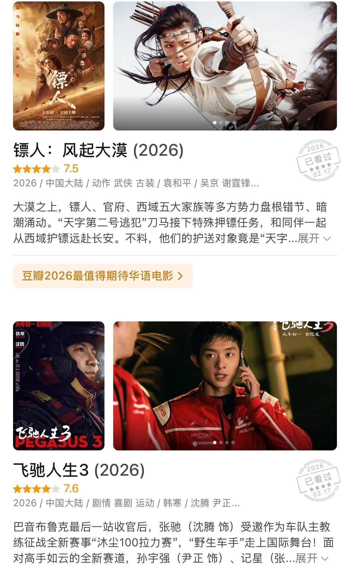 春节档三部电影率先开分,《飞驰人生3》7.6分,《星河入梦》7.0分,《镖人:风起大漠》7.5分。