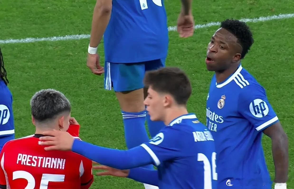 维尼修斯立刻暴走,他找到主裁判进行投诉,称普雷斯蒂亚尼骂他为猴子。随后,维尼修斯拒绝继续比赛,并走到替补席,比赛因此一度中断。