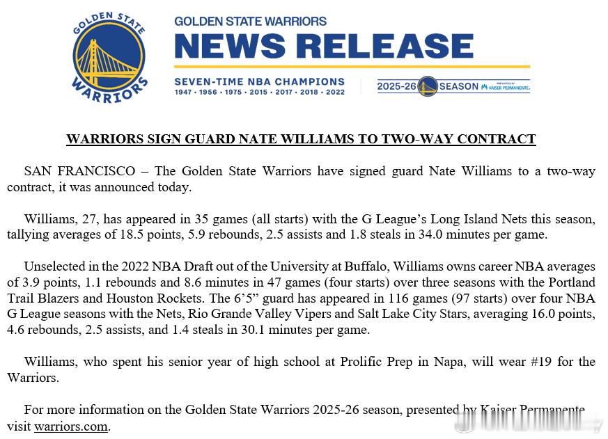 威廉姆斯填补了金州勇士队目前空缺的第三个双向合同名额。目前,勇士队共有三名双向合同球员:他、马莱维·莱昂斯和LJ·克莱尔。