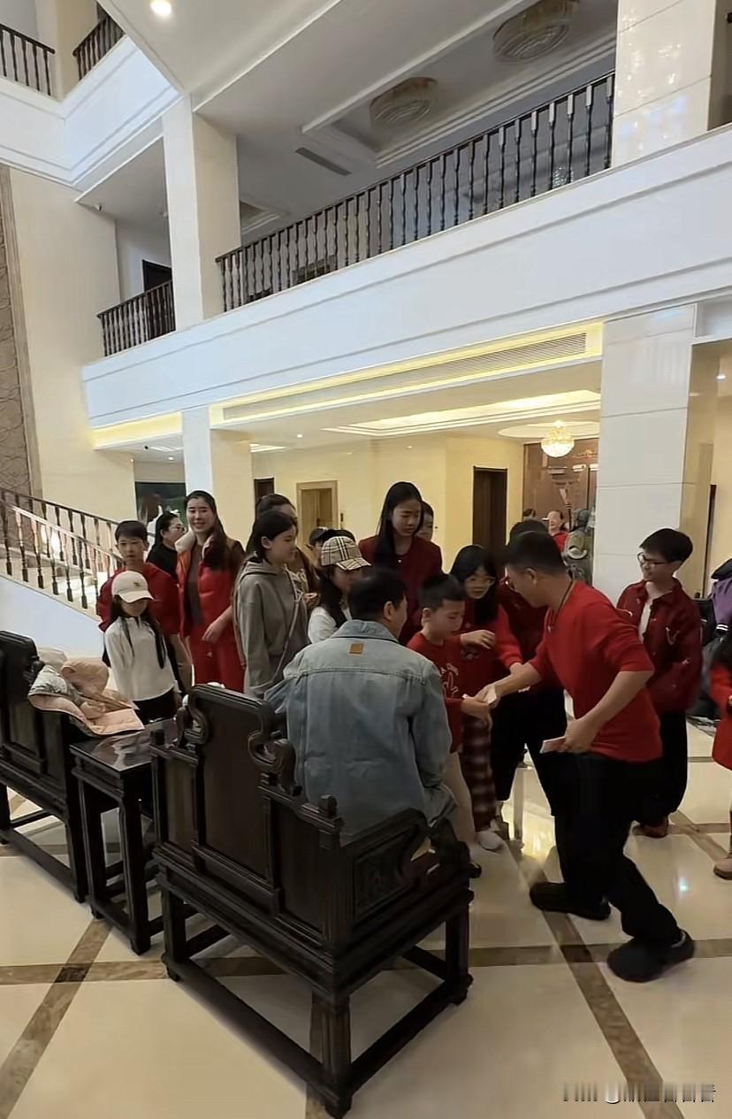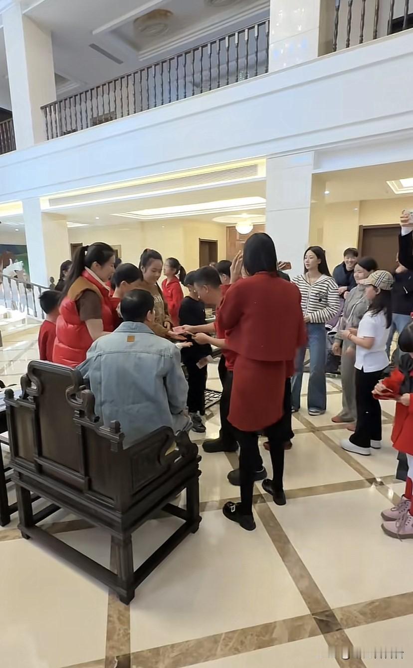 杨子家过年真是热闹,全是一波波要红包的小孩,一群孩子都要向杨子磕头,杨子坐在椅子上稳如泰山,可见这辈分不能乱,杨子穿一身牛仔和一双运动鞋,看起来还是很年轻的,大女儿杨海润也在老家过年,从去年杨海润就一直跟着爸爸杨子到处出差,过年也自然在老家过,只是现场并没有见到杨子的两个儿子,看来安迪和安麟并没有回河北过年,不过在老家过年确实是热闹,光孩子至少也有二十个了。