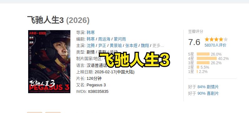 春节档6部电影,豆瓣评分: 1、镖人,7.5分!去年徐克射雕才5.2!票房一般,口碑很好!后续可能逆袭!现在武侠片还有这口碑,真的很厉害,后续还可能上涨!镖人官方账号也很高兴,第一时间发了豆瓣评分海报,为票房助力! 2、飞驰人生3,7.6分,才比镖人多0.1分,可是票房完全不成正比,韩寒搞电影,确实有一套! 3、惊蛰无声,暂无评分,看得人也不少啊,为什么没有人评分?以张艺谋的实力,至少7.0分! 4、熊出没,暂无评分,都是孩子、家长看,看完就完了,应该懒得评。 5、熊猫计划,暂无评分,看的人少,也没兴趣评分。 6、星河入梦,7.0分!很意外、很惊喜,导演韩延确实可以,没怎么宣传,票房一般,口碑还不错!非主流科幻电影,拿到春节档拼杀,小看了,有机会去看看! 你看了哪一部?评价怎么样?豆瓣评分客观吗?分享分享!