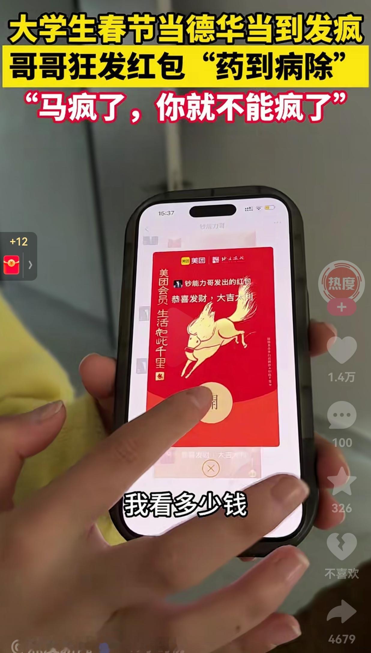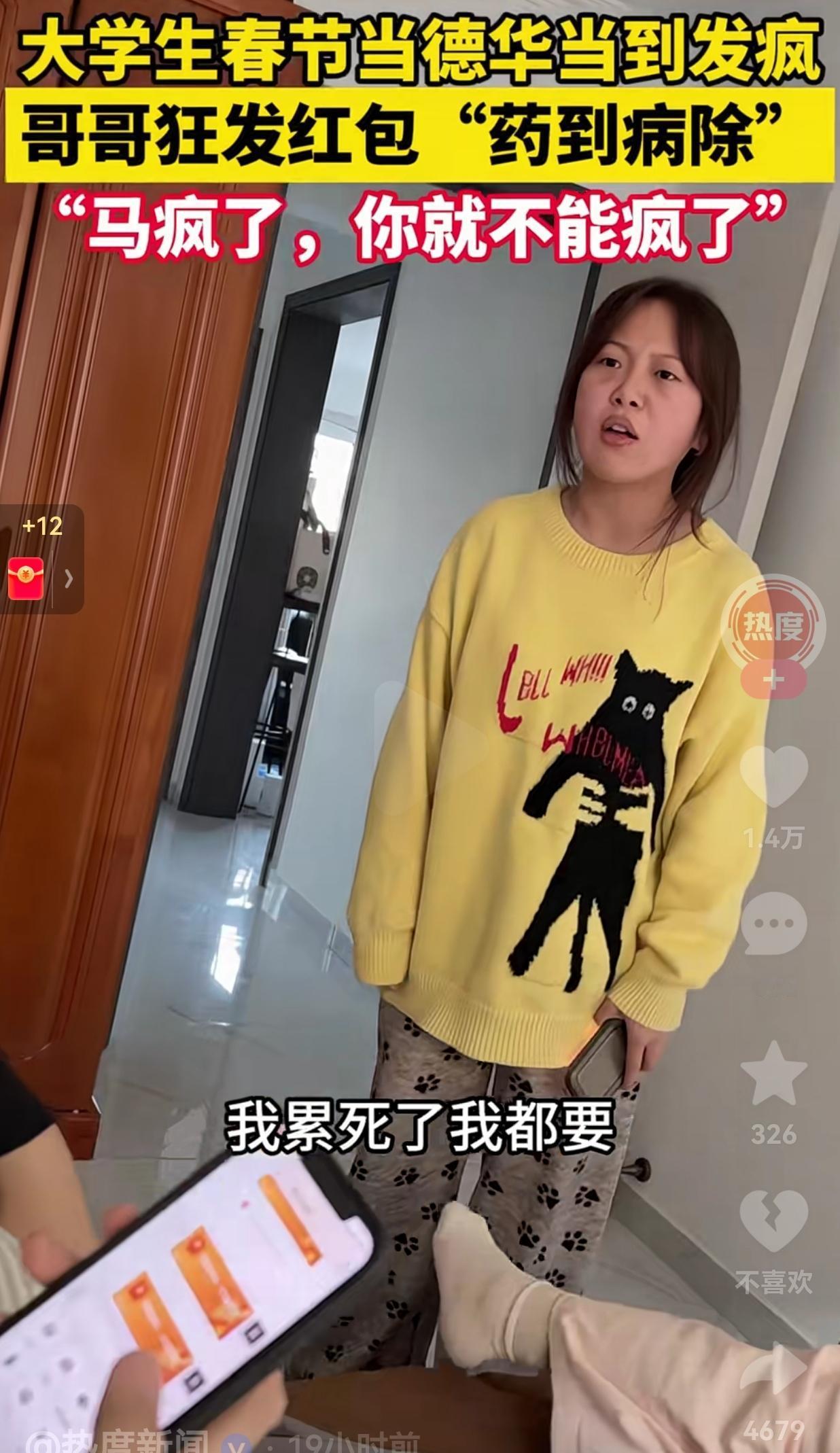 没有钱解决不了的问题,如果解决不了,那就是钱不够!2月17日,辽宁沈阳,一个女大学生的春节带娃日常,把全网都笑疯了,笑着笑着又有点鼻酸。 事情是这样的:她放假回家,被亲哥安排成了全职带娃“德华”,每天早上6点就爬起来带娃,连轴转了好几天,终于绷不住了。 视频里,她穿着黄毛衣、踩着带爪印的睡裤,站在卧室门口,整个人都处在“发疯”边缘。 对着哥哥一顿疯狂输出:“我6点起来带孩子!让不让人活了!我累死了我都要!我不干了!爱谁带谁带吧!” 她一边咆哮,一边在房间里来回踱步,头发都炸毛了,那股子委屈劲儿,隔着屏幕都能感觉到。 就在大家以为她要彻底撂挑子的时候,她低头看了一眼手机,下一秒,画风突变。 刚才还气得跳脚的她,突然捂着嘴“噗嗤”一声笑了出来,眼睛弯成了月牙,连语气都软了:“这是啥呀哥?” 屏幕上赫然是一个印着“齐白石小疯马”的红包封面,她一边吐槽“这不齐白石的小疯马吗”,一边手已经不自觉地点开了红包。 “我看多少钱……哎呦我去!200块!” 看清金额的那一刻,她整个人都笑出了眼泪,刚才的怨气瞬间烟消云散,对着手机屏幕就喊:“还得是我哥懂我!知道我最喜欢美团会员的小疯马了!你就是我的伯乐!” 她一边蹦跶一边喊“爱你爱你”,还拍着胸脯说:“我就是你齐白石的千里马!”刚才还说“爱谁带谁带”,现在已经一秒切换状态,对着镜头拱手作揖:“行那老奴退下了,退下你们慢慢休息吧!”然后转身就去继续带娃了。 原来,是她哥在微信里狂发红包,一个接一个的转账提示,直接把她的“罢工宣言”给堵了回去。 网友看到后评论道: “这哪是红包啊,这是速效救心丸!” 也有的网友说:“钱到位,情绪瞬间到位,主打一个真实。” 还有的网友说:“我懂,我在家带侄子也是,只要我哥发红包,我能把娃举高高转三圈。” 其实,这事儿看着好笑,细想一下,又特别真实。 我们这代年轻人,春节回家,谁还没当过几天“临时德华”呢? 小时候盼着过年,是盼着新衣服、压岁钱。长大了过年,是盼着能歇口气,结果一回家,就被各种“家庭任务”安排得明明白白:带娃、走亲戚、做家务、应付长辈的灵魂拷问…… 我们嘴上抱怨着“不想回家,因为过年太累了”,可真当家人需要的时候,还是会心甘情愿地搭把手。 就像这个女生,她吐槽归吐槽,红包一到,立马“真香”。不是她拜金,而是她知道,哥哥的红包,是对她辛苦的认可;她的“妥协”,是对家人的爱。 我们总说,亲情是无价的,但有时候,那些实实在在的红包和关心,才是把我们从“崩溃边缘”拉回来的底气。 因为,它在说:“我知道你累,谢谢你。” 针对此事,你有什么看法呢?