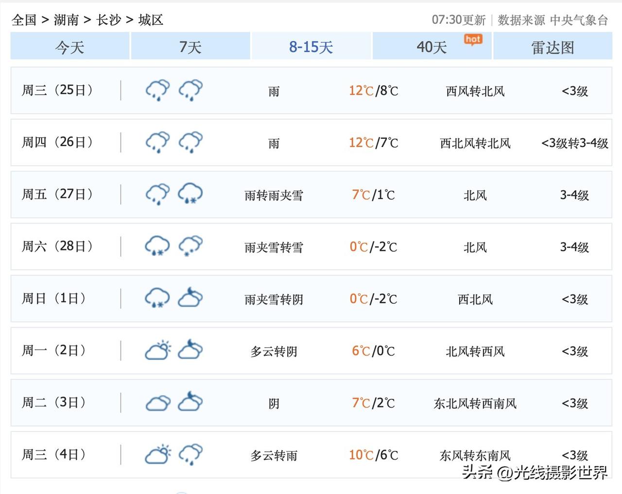 2月18日到3月4日,湖南省长沙市,天气随机播放,一会儿下雪,一会儿25度高温夏天……过山车天气频繁,快速升温,快速降温,快速升温……晴雨不定……啊啊啊!简直要命啊! 2月21日,长沙最高气温25度……可以穿短裤短袖和夏天的裙子啊! …… 2月24日,长沙市小雨,气温暴跌至3-6度,断崖式大降温……从夏天跑步进入冬天! …… 2月28日,长沙,雨夹雪转雪……最低气温-2度,零下2度……最高气温0度……啊啊啊!直接掉入冰窟窿啊! 哎呀!2月23日到3月4日,长沙市,气温持续低迷,阴冷潮湿……湿冷的魔法攻击持续……西伯利亚的超强冷空气南下……北极大boss放大招……啊啊啊! 未来15天,长沙市的小伙伴们,一定要小心谨慎,以免去医院或者小诊所花大钱啊!