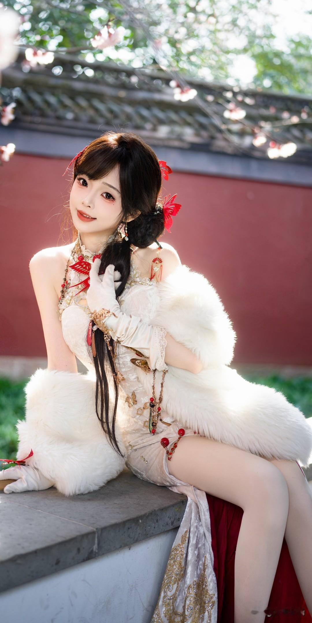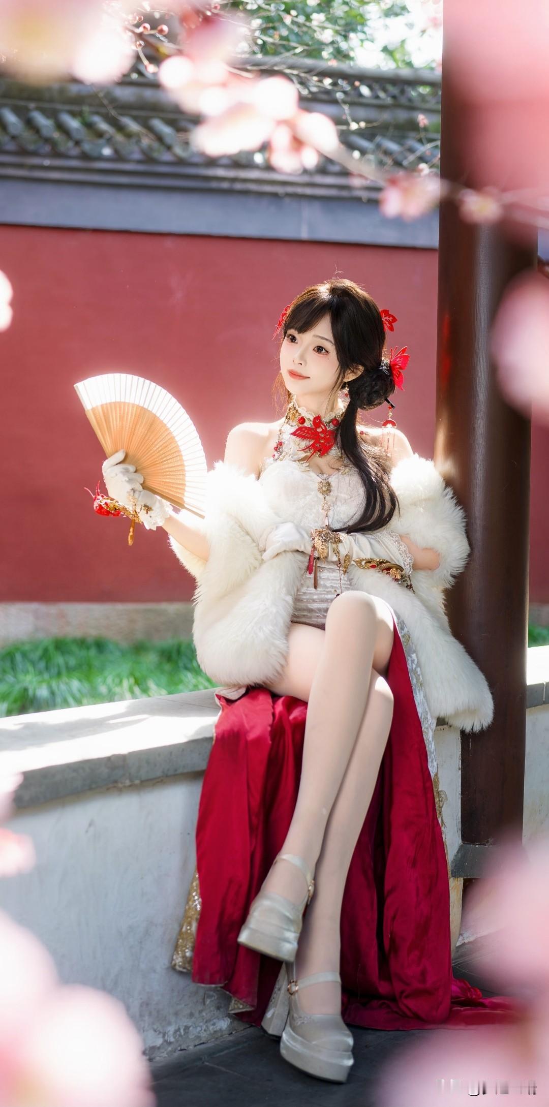 樱花树下,红衣美人倚栏,春意盎然。