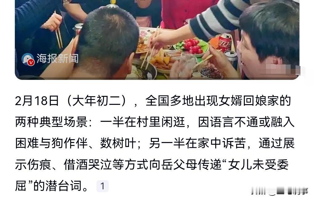 这真的是中国特色。 春节期间女婿去女方家拜年。 会出现一些特有的景象。 有的会在村里闲逛,很多融入不进去,只能够无聊的打发时间,和狗对视。 还有的向兔父母诉苦,展示伤痕和哭泣,潜台词就是表示没有欺负你女儿。 估计男人回女方家拜年,内向的不善交际的,那也是一种痛苦啊。