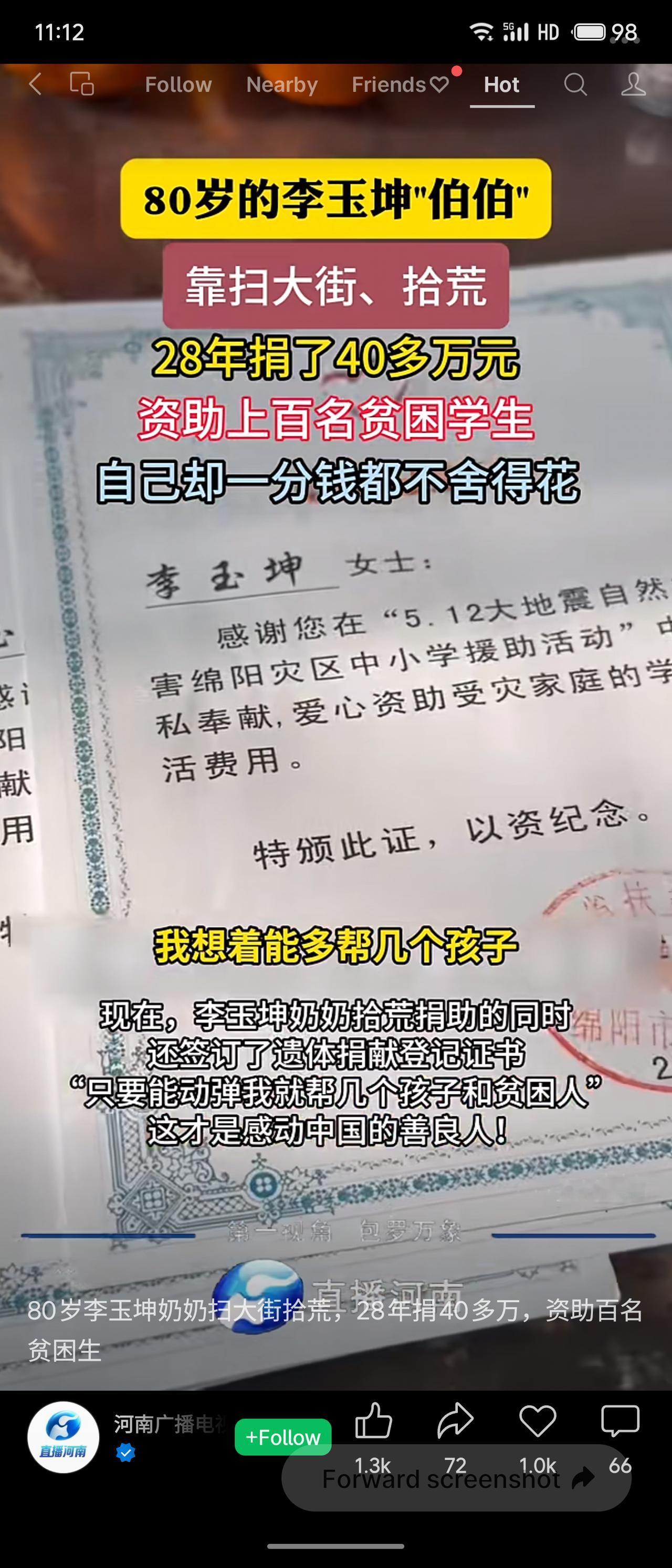 80岁的李玉坤奶奶靠扫大街、拾荒,28年累计捐款40余万元,资助上百名贫困学生,自己却极其节俭。她的大爱无疆、无私奉献精神令人动容,是真正感动中国的善良榜样。