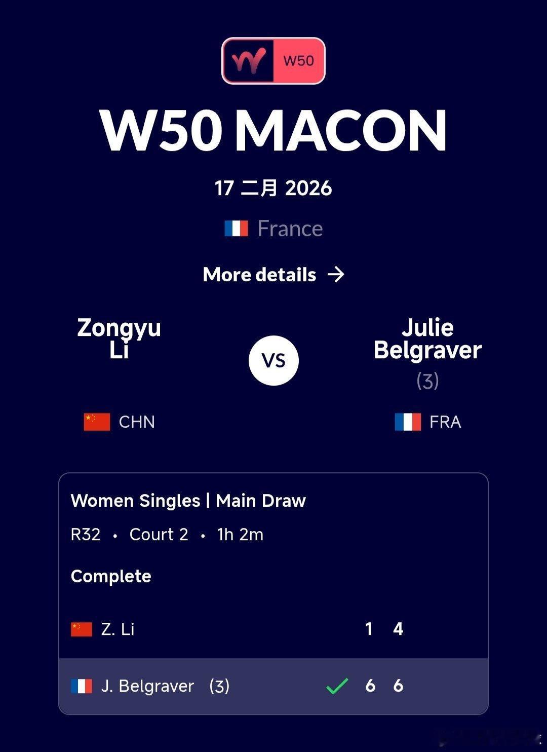 李宗钰🇨🇳1-6/4-6不敌3号种子贝尔格雷弗🇫🇷,无缘晋级。本站比赛李宗钰搭档李羽芸参加双打,双打加油!