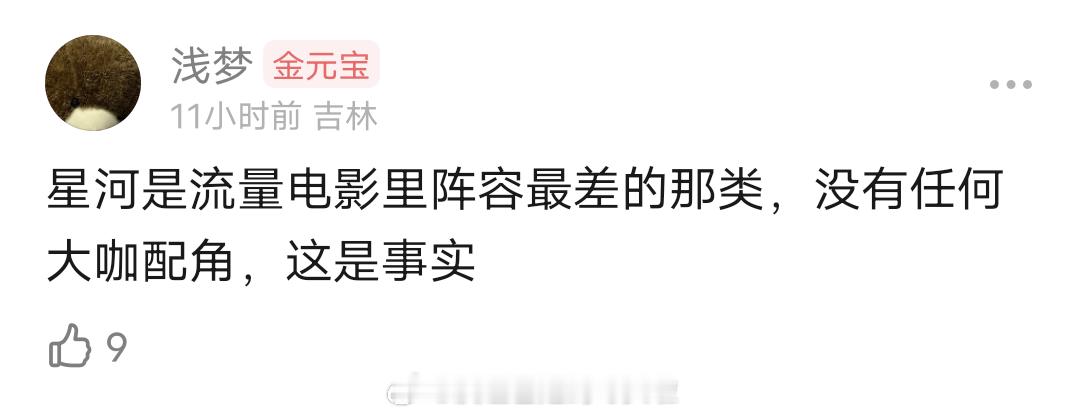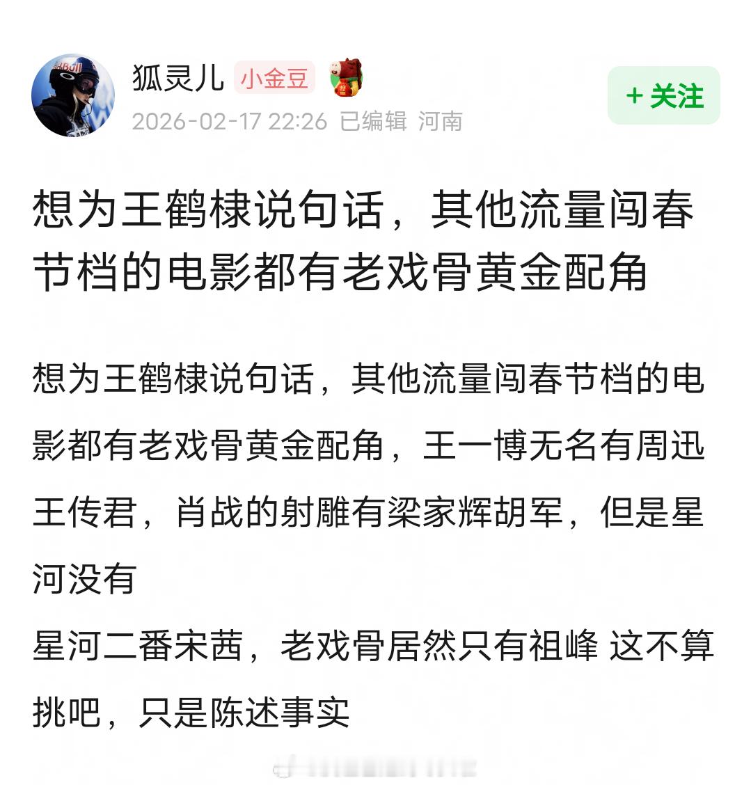 网友说其他流量闯春节档的电影都有老戏骨和黄金配角保驾护航,王一博无名有周迅王传君,肖战射雕有梁家辉胡军。但是王鹤棣《星河入梦》没有任何大咖配角,二番宋茜,祖峰也不算熟脸,属于流量电影里阵容最差的那类。第一批春节档观众发声 星河入梦向你发来联机邀请 星河入梦豆瓣7.0