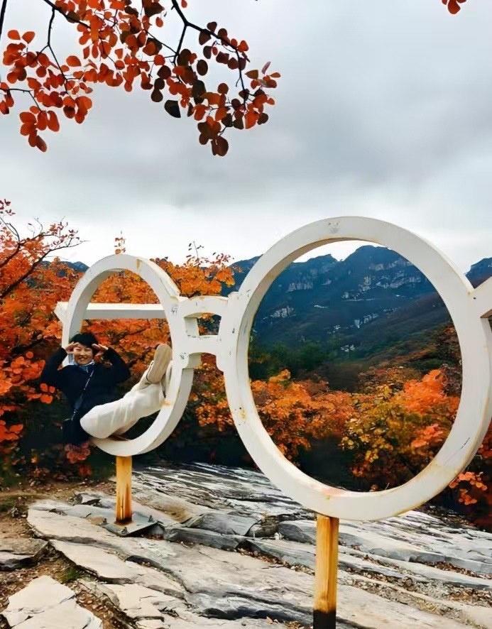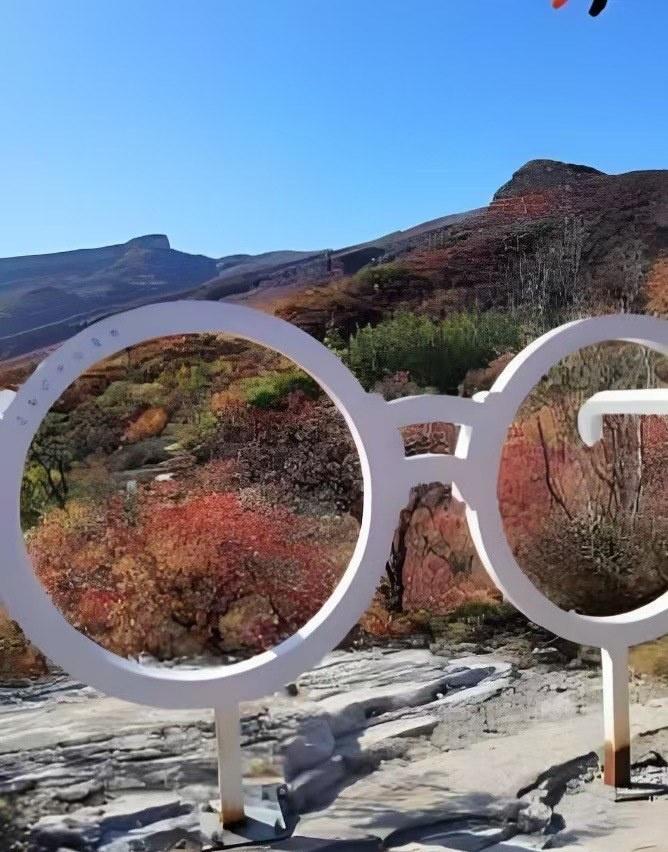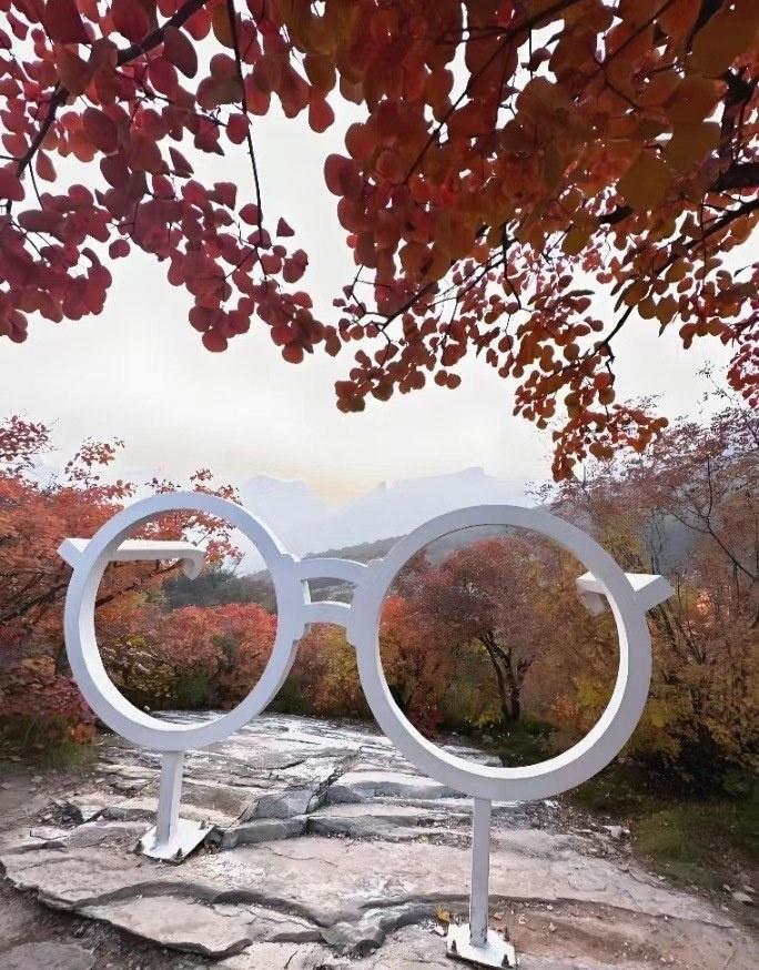 坡峰岭-眼镜雕塑 📍北京 坡峰岭-眼镜雕塑 站位角度: 人物嵌入巨型眼镜装置的“镜框”内,低角度仰拍,让装置、人物与背景山峦自然互动。 构图手法: 用装置做框架式构图,串联前景装置、中景人物、背景秋山,层次清晰。 色彩平衡: 保留秋景暖调(红黄叶),搭配冷调(灰云青山),白平衡偏暖强化秋日氛围。 拍照参数: 光圈f/5.6(保景深)、快门1/200s(抓拍姿态)、ISO100(阴天保障画质)。 全天开放:8:00—17:00(16:00停止入园 1. 乘地铁1号线至房山城关站出,步行周口店村西; 2.进入景区大门后,沿红叶大峡谷主路步行约20分钟,途经古藤长廊后右转,沿指示牌前行5分钟即达眼镜雕塑。 9:00-11:00光线柔和,红叶与雕塑相映,出片效果佳,人流较少 1. 景区内多山路,建议穿舒适防滑的徒步鞋,秋季温差大需备薄外套。 2. 爱护雕塑及周边环境,禁止攀爬、刻画,勿随意丢弃垃圾。 3. 旺季及周末人流较大,建议提前1小时到达景区,错峰出行;景区内餐饮选择较少,可自备少量零食和饮用水。近郊徒步指南 雕塑