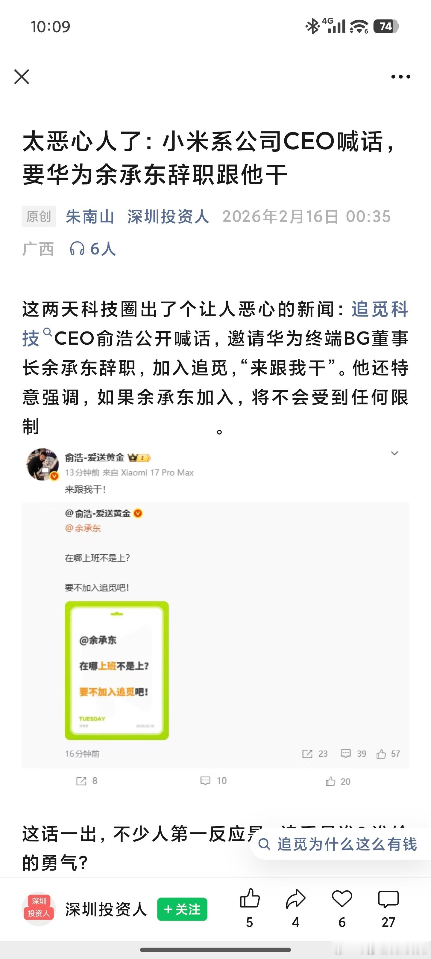 这俩天追觅邀请余总引发了争论觉得这是看不起余总😳这我就不理解了,追觅也不算小公司了正常人看到,邀请余总,那肯定是认可余总的能力,需要余总带他起飞啊为什么有些群体看到就觉得是在贬低余总?