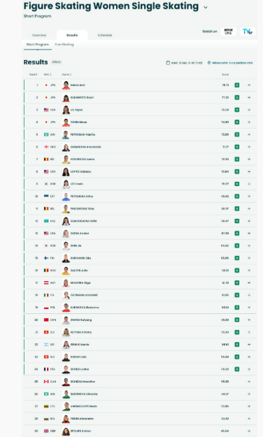 2月17日,冬奥会花样滑冰女子单人滑结束短节目。日本选手中井亚美和坂本花织排名前两位,美国队刘美贤暂列第三,俄罗斯彼得罗相排名第五,中国小将张瑞阳以59.38分排名第20位进入自由滑。