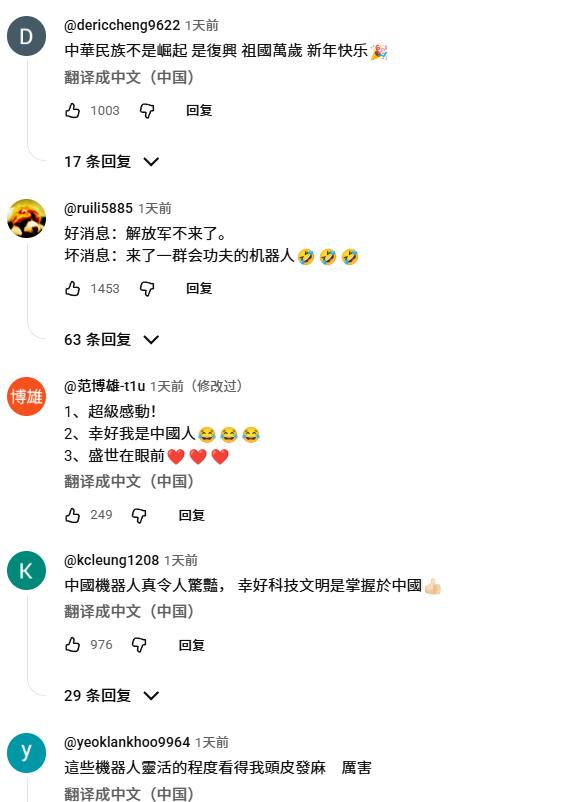 钢铁般的意志并不能很快使人冷静,但当钢铁有了意志的时候,通常都可以让人冷静的思考人生。 看了春晚机器人表演后,岛内网友:我為我的祖國中國感到無比的光榮與驕傲,我是台灣人更是一個驕傲的中國人。衷心的期盼兩岸趕快統一台灣回歸祖國!!! 岛内青鸟:不可能!!!這一切都是幻覺,嚇不著我的。那個不要給我看,假的啦、ai啦。 @ouyaobaixiang:承认机器人,那中国就有最强的机器人,如果是ai,那中国就有最强的ai,一根筋变两头堵。 德国网友:我在德国,网速很慢。我心里在想:我们迷路了。 欧洲网友深有同感:想法一样,我试着喝点啥来缓解,三杯之后好多了。 美国网友在NBC下面的评论:他们窃取了我们的技术,甚至包括我们目前还没有的技术。 同意的美国网友:制裁的代价是什么?代价是中国做的更好。 我喜欢这样的表演,我更愿意宣传这样的表演。表演是衣服,衣服就该漂漂亮亮的穿给别人看。