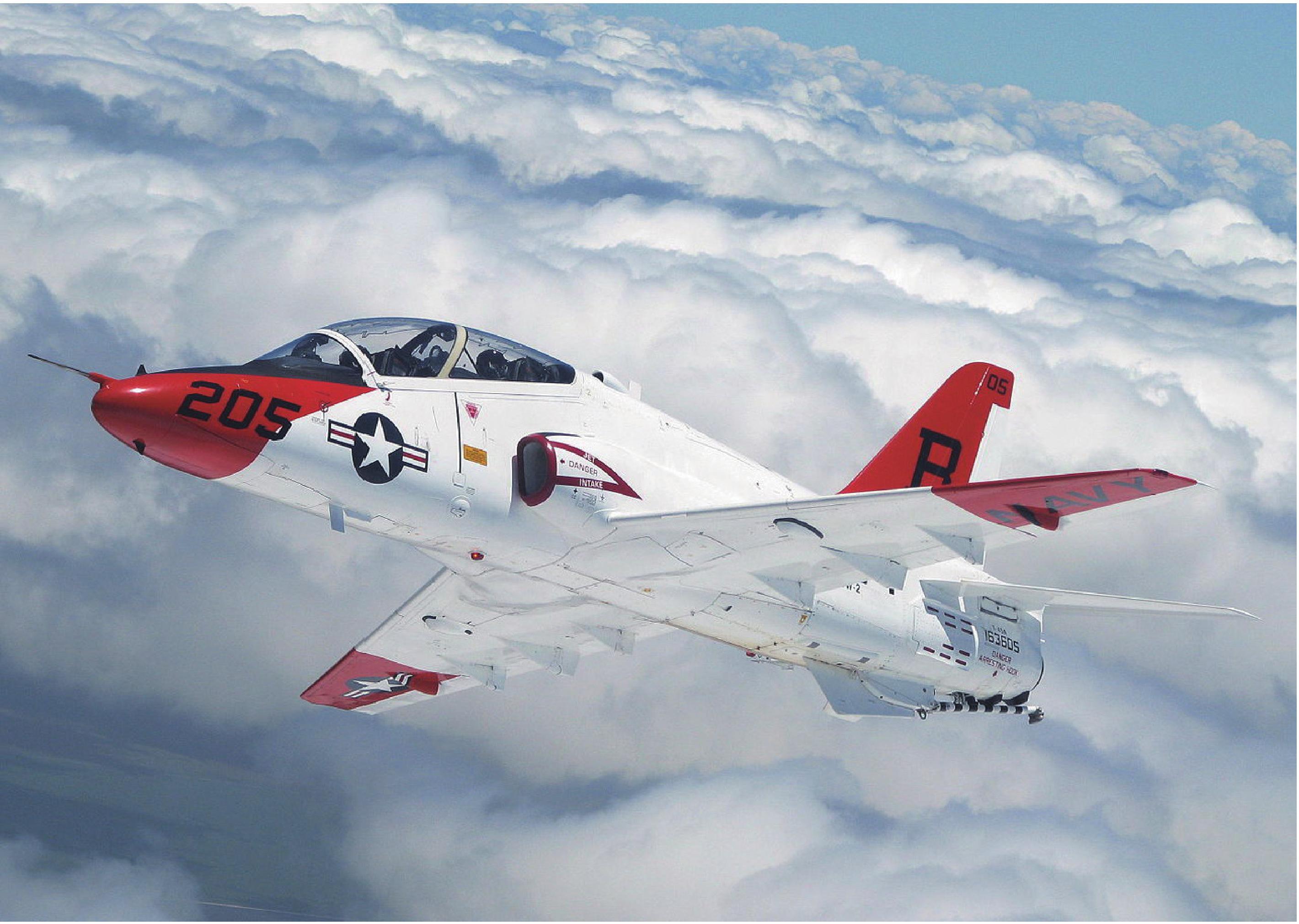 T-45是在英国航宇公司“鹰”系列教练机的基础上研制的,根据美国海军的特殊要求,T-45的前、主起落架重新设计,增设拦阻钩并加强机体,以满足舰上起落的要求。该机安装的电子设备和显示器比较先进,能满足在航空母舰上起降等高级训练的要求。翼面布局为后掠式下单翼,动力装置采用单台罗尔斯•罗伊斯F405-RR-401型涡轮风扇发动机。