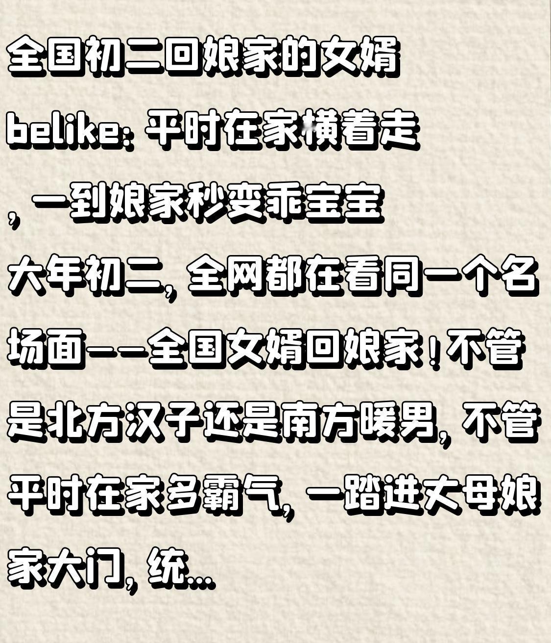 全国初二回娘家的女婿belike:平时在家横着走,一到娘家秒变乖宝宝 大年初二,全网都在看同一个名场面——全国女婿回娘家!不管是北方汉子还是南方暖男,不管平时在家多霸气,一踏进丈母娘家大门,统一切换“乖巧模式”,笑翻全网! 你家老公是不是也这样?出门前精心打扮,礼物拎得比人高,皮鞋擦得锃亮,笑容标准到像参加面试。进门先喊爸妈,双手递礼物,说话轻声细语,长辈不问话绝不多嘴,主打一个懂事又拘谨。 饭桌上才是“高光时刻”。只夹眼前的菜,丈母娘往碗里夹菜,堆成小山也不敢说饱,笑着往嘴里送,连说“好吃”。老丈人想喝两杯,立马端杯陪饮,不劝酒、不抢话,分寸感拉满。被问工作、收入、娃成绩,不烦躁不敷衍,句句答得体面,生怕给老婆丢面子。 吃饱喝足,更真实的来了。没活找活干,洗碗擦桌、扫地浇花,实在没事就蹲院子里逗狗、发呆,甚至对着墙角数叶子,就为了不尴尬。新女婿手足无措,老女婿淡定摸鱼,全国女婿统一姿势,相似度高达99%! 很多人笑他们“怕丈母娘”,其实这不是怕,是藏在笨拙里的爱。他们平时在家可能甩手掌柜,回娘家却主动表现,不是装样子,是想让岳父岳母放心:你们的女儿嫁对了人,我会好好疼她、护着家。这份拘谨,是对长辈的尊重;这份乖巧,是对妻子的承诺。 初二回娘家,回的是女儿的心安,也是女婿的“年度大考”。没有套路,没有敷衍,只有真心实意的陪伴。看着岳父岳母笑得开心,老婆在旁安心做回小孩,再拘谨也值得,再忙碌也幸福。 这就是中国女婿最真实的样子:嘴上不说爱,行动全是爱。把对妻子的深情,藏在每一个懂事的细节里;把对家人的重视,落在每一次真诚的付出中。 今天,为所有回娘家的女婿点赞!愿你们考核全过,夸奖全收,吃得饱、玩得好,顺利通关,带着满车的爱与温暖,阖家幸福,马年大吉!