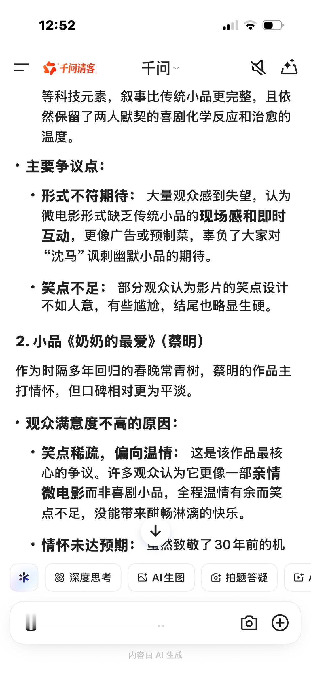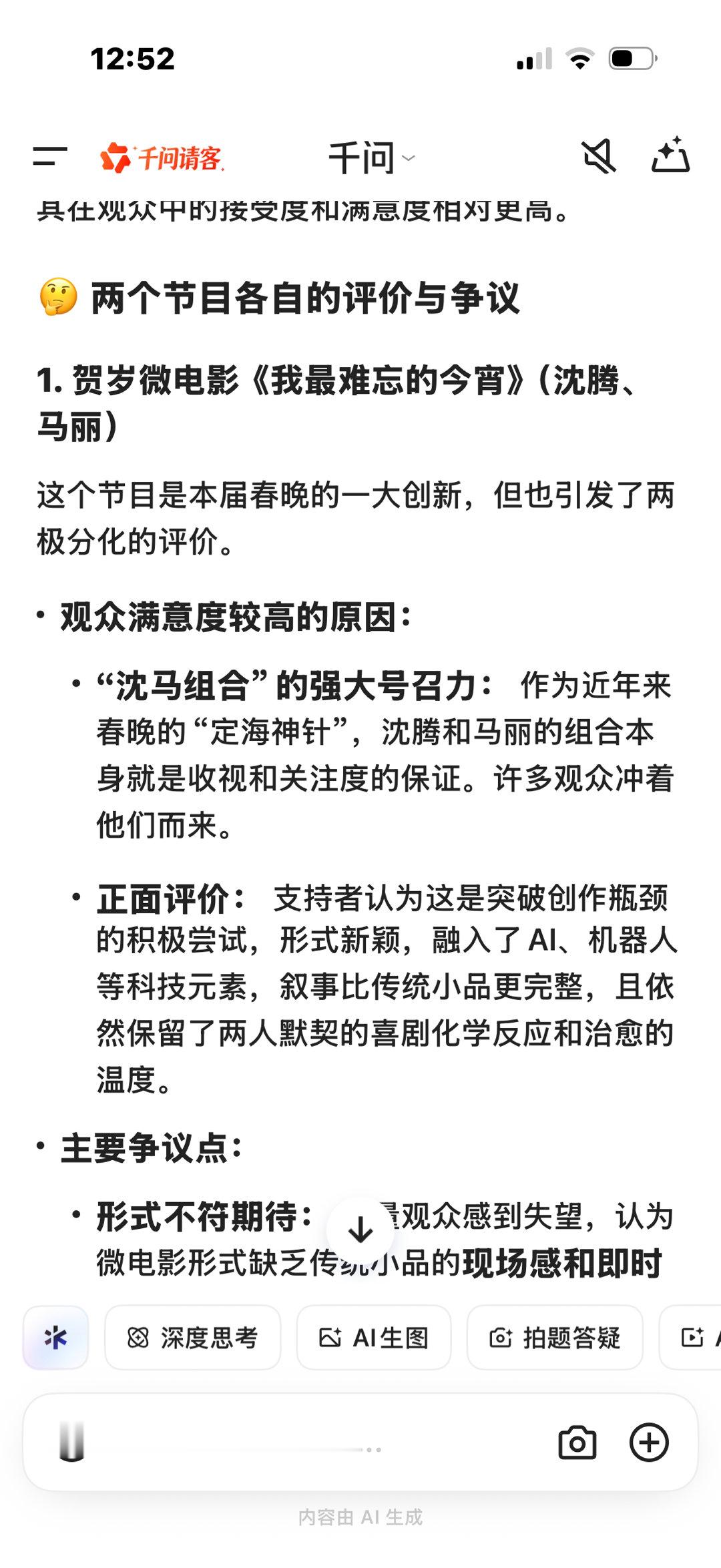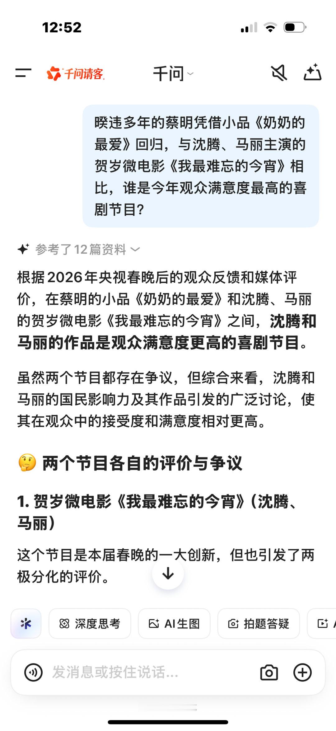 我AI聊春晚就春晚印象比较深刻的蔡明小品《奶奶的最爱》与沈腾、马丽主演的贺岁微电影《我最难忘的今宵》和AI展开了讨论,回答的很准确也很真诚:“虽然两个节目都存在争议,但综合来看沈腾和马丽的国民影响力及其作品引发的广泛讨论,使其在观众中的接受度和满意度相对更高”“沈马组合的强大号召力: 作为近年来春晚的“定海神针”,沈腾和马丽的组合本身就是收视和关注度的保证。许多观众冲着他们而来。” 有关于蔡明的节目“情怀未达预期: 虽然致敬了30年前的机器人经典,但“毒舌”喜剧灵魂的缺失让部分老观众感到意难平,认为剧本没能拯救情怀”“总结来说,尽管沈腾和马丽的微电影在形式上备受争议,但其作品的讨论度、国民组合的吸引力以及相对更符合喜剧期待的呈现,使其在观众满意度上略胜一筹。而蔡明的小品则更多地被评价为一部“笑不出来”的温情作品。”春晚在不断创新的同时也以自己的方式为大家留下深刻的记忆,无论是以各种形式都是我们爱看的那个春晚!