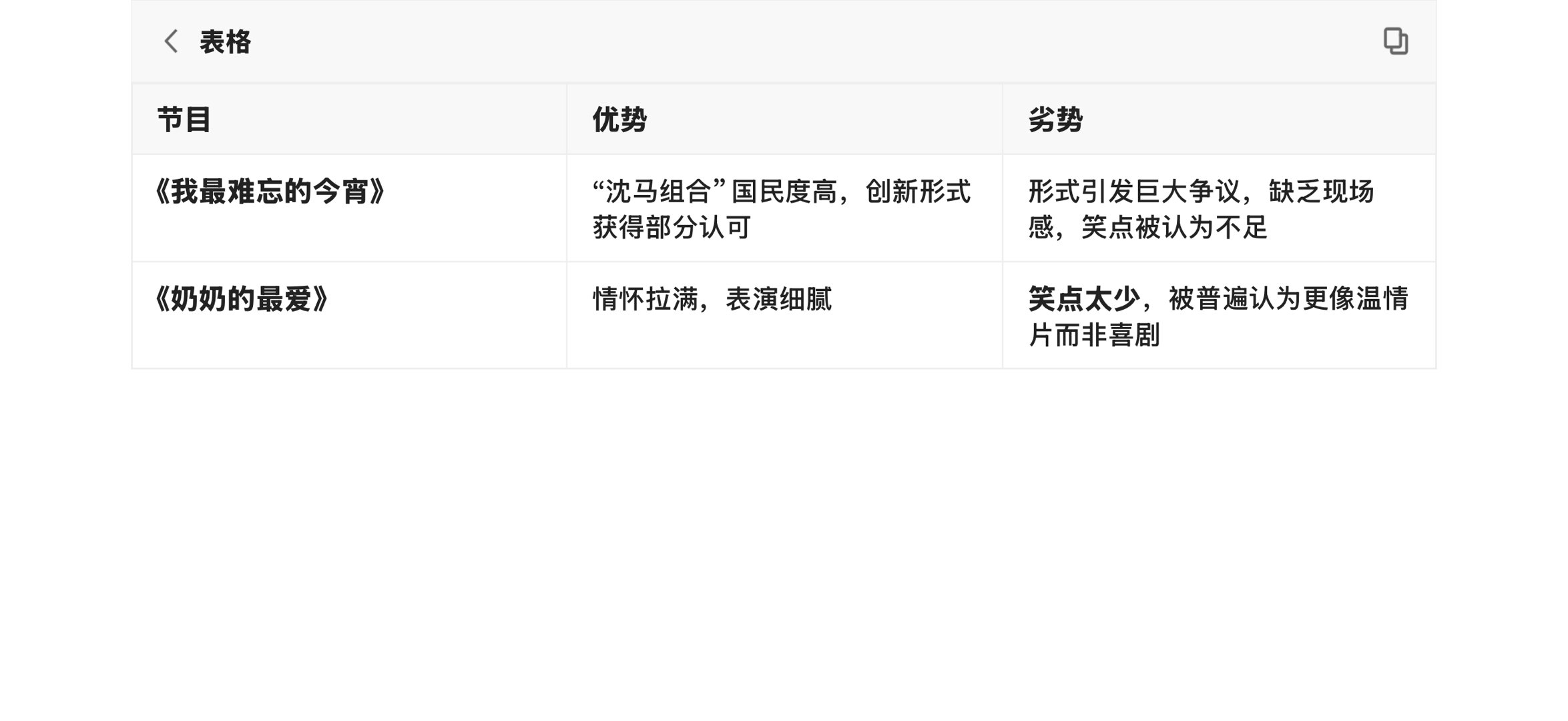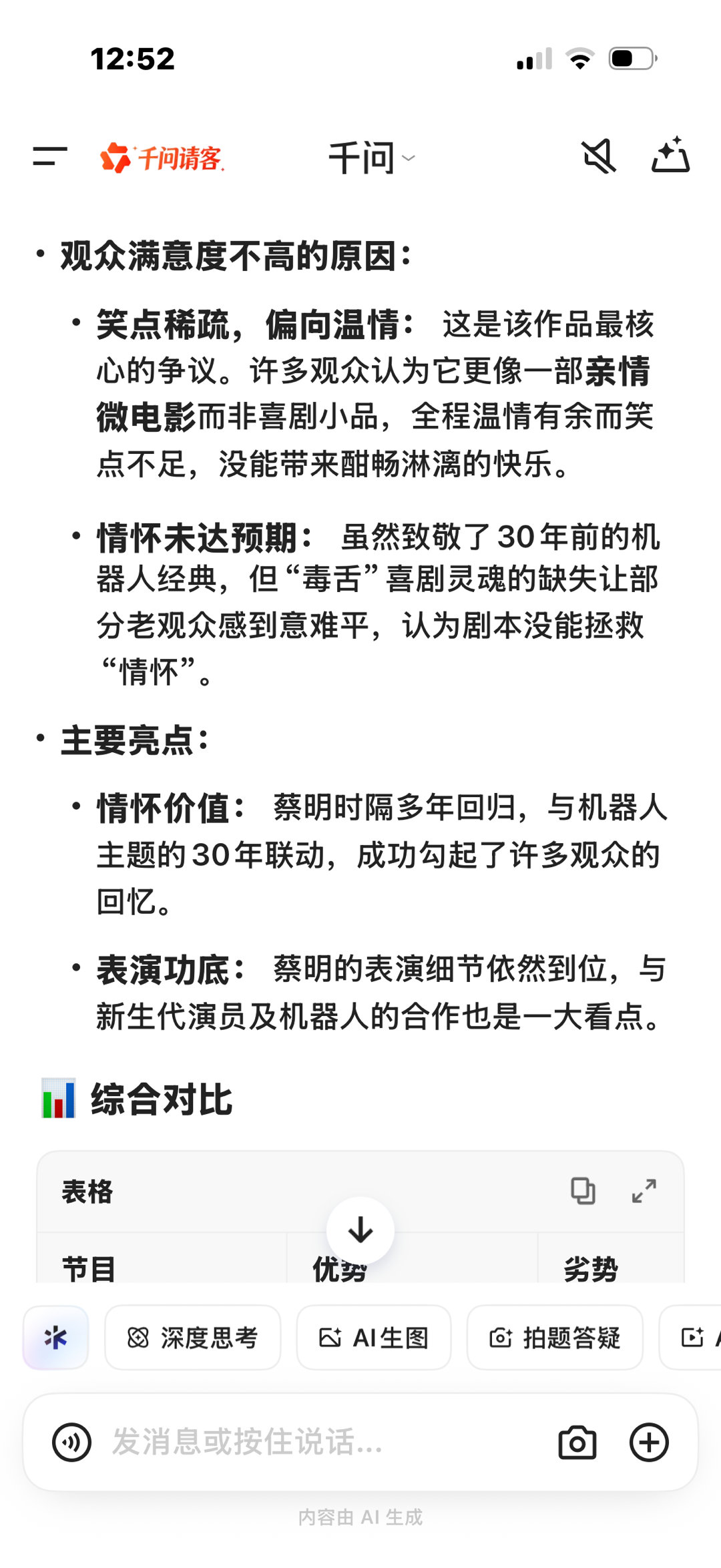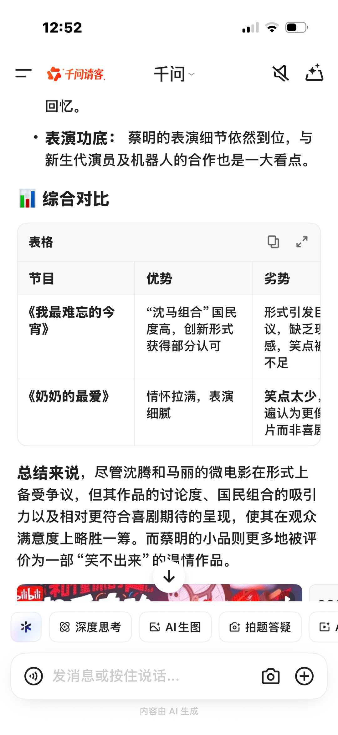我AI聊春晚就春晚印象比较深刻的蔡明小品《奶奶的最爱》与沈腾、马丽主演的贺岁微电影《我最难忘的今宵》和AI展开了讨论,回答的很准确也很真诚:“虽然两个节目都存在争议,但综合来看沈腾和马丽的国民影响力及其作品引发的广泛讨论,使其在观众中的接受度和满意度相对更高”“沈马组合的强大号召力: 作为近年来春晚的“定海神针”,沈腾和马丽的组合本身就是收视和关注度的保证。许多观众冲着他们而来。” 有关于蔡明的节目“情怀未达预期: 虽然致敬了30年前的机器人经典,但“毒舌”喜剧灵魂的缺失让部分老观众感到意难平,认为剧本没能拯救情怀”“总结来说,尽管沈腾和马丽的微电影在形式上备受争议,但其作品的讨论度、国民组合的吸引力以及相对更符合喜剧期待的呈现,使其在观众满意度上略胜一筹。而蔡明的小品则更多地被评价为一部“笑不出来”的温情作品。”春晚在不断创新的同时也以自己的方式为大家留下深刻的记忆,无论是以各种形式都是我们爱看的那个春晚!