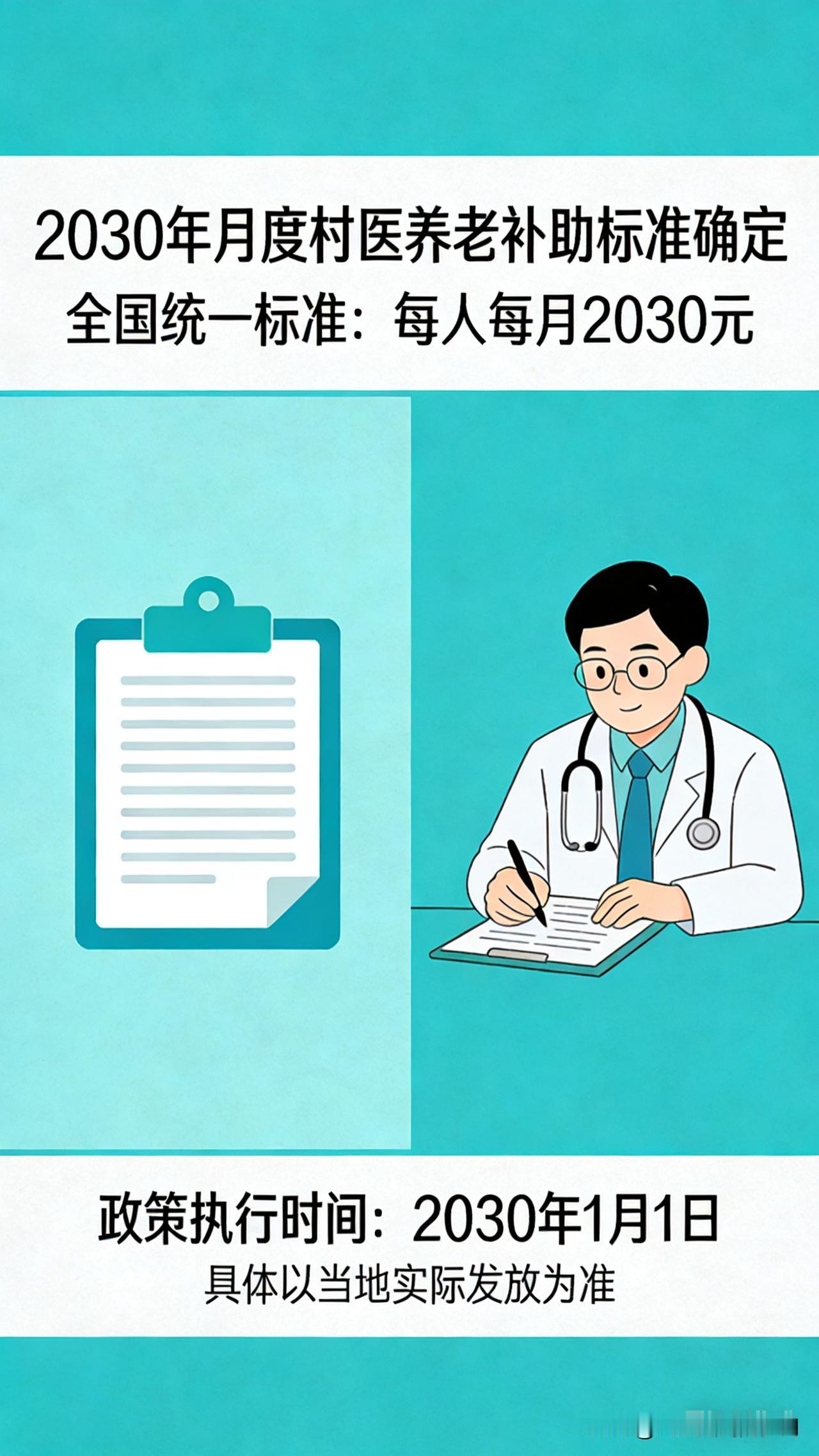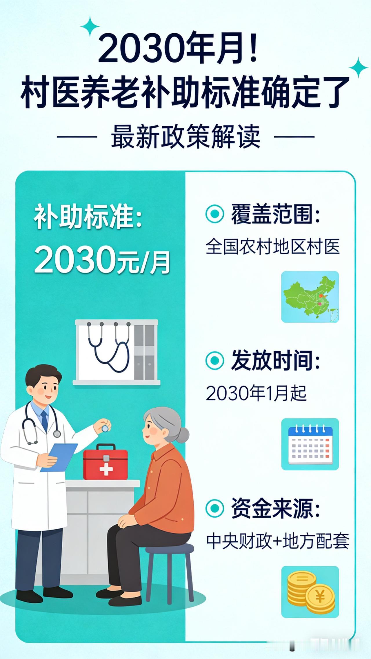 2030元/月!村医养老补助标准,确定了 乡村医生扎根基层、守护乡邻健康,是农村医疗卫生网的“最前哨”。长期以来,村医群体的养老保障备受关注,如今一项暖心政策正式落地:服务满30年的村医,养老补助每月不低于2030元,这一标准以地方最低工资为锚点,为老村医晚年生活筑牢兜底保障,让坚守乡村的医者老有所养、安心退岗。 此次明确的2030元/月养老补助,并非简单的定额补贴,而是贴合村医奉献年限的阶梯式保障。政策明确,达到法定退休年龄、未享受企业职工基本养老保险待遇的乡村医生,可按在岗服务年限领取补助:累计服务满30年(含30年),每月领取2030元全额补助;服务年限5年以上、不足30年的,按“2030元×实际服务年限÷30”的比例核算,服务25年可领1691元、20年可领1353元、10年可领676元,真正实现“干得越久、保障越足”。更暖心的是,补助标准将随当地最低工资同步动态调整,让老村医共享发展红利,告别“一次性补贴”的短期保障,拥有长期稳定的生活支撑。 这一政策的落地,直击村医养老的核心痛点。过去,不少老村医“半农半医”坚守半生,背着药箱翻山越岭、走村串户,用简陋设备守护村民健康,却因保障缺失,晚年生活拮据。如今2030元/月的补助标准,对农村老人而言,足以覆盖日常开销与基础医疗支出,彻底解决“干到退休无依靠”的后顾之忧。同时,政策明确补助经费由财政全额保障、纳入年度预算,依托社保卡“一卡通”发放,杜绝拖欠、克扣,让补助足额直达村医手中,彰显政策的刚性与温度。 作为全国村医养老保障的标杆举措,2030元/月的补助标准,不仅是对老村医奉献的认可,更释放出重视基层医疗、关爱乡村医者的强烈信号。目前,全国多地已跟进提升村医养老待遇,浙江、武汉、鄂尔多斯等地相继推出千元以上月度补助,逐步构建起“在岗有薪酬、参保有补助、退岗有保障”的全链条体系。从“赤脚行医”到“养老无忧”,从“默默奉献”到“被温柔以待”,村医群体的保障升级,既是民生温度的体现,更是筑牢乡村医疗根基的关键一步。 医者仁心,不负韶华;桑榆非晚,保障护航。2030元/月的养老补助,是给老村医的“定心丸”,也是给在岗村医的“强心剂”。未来,随着更多地方对标落实、提标扩面,村医养老保障将更趋完善,让每一位守护乡村健康的医者,都能在晚年收获尊严与安稳,让乡村医疗队伍更稳定、更有力量,持续守护亿万农民的健康幸福。