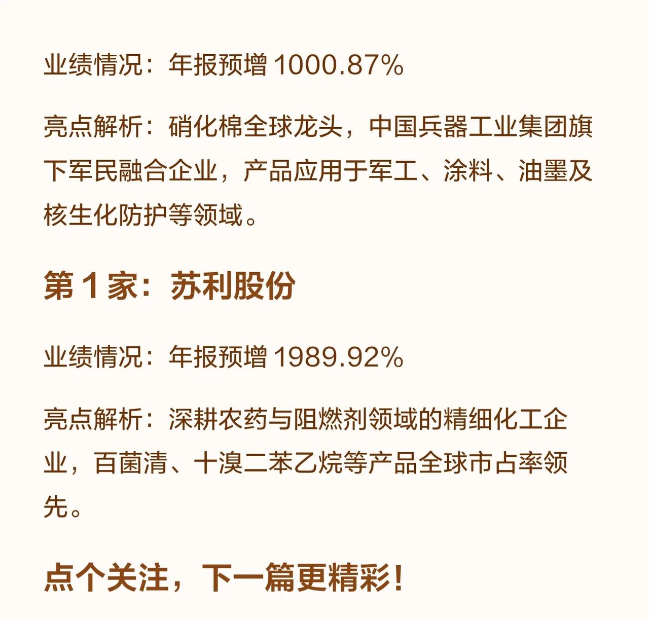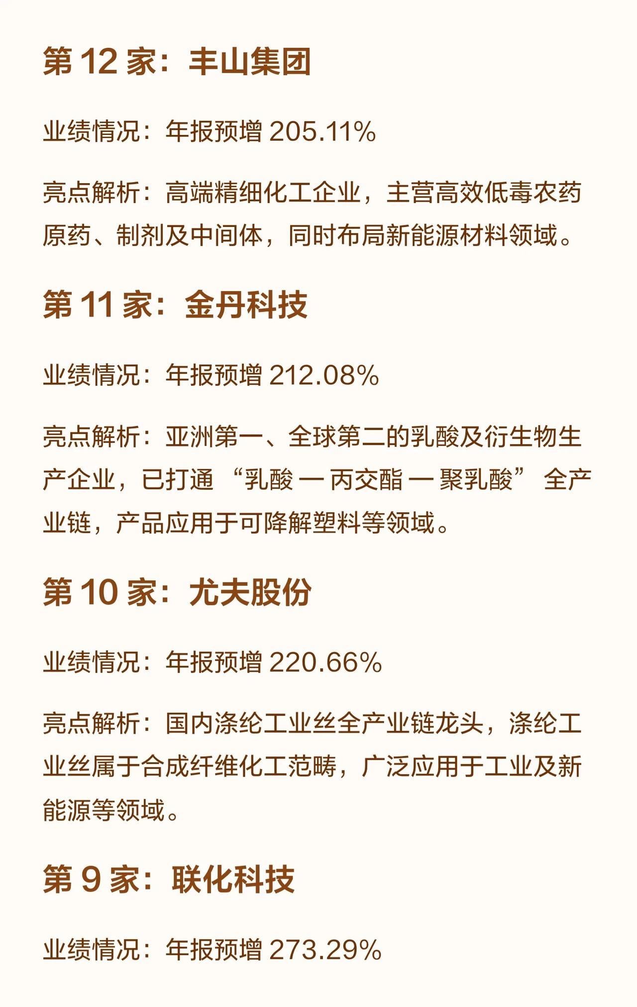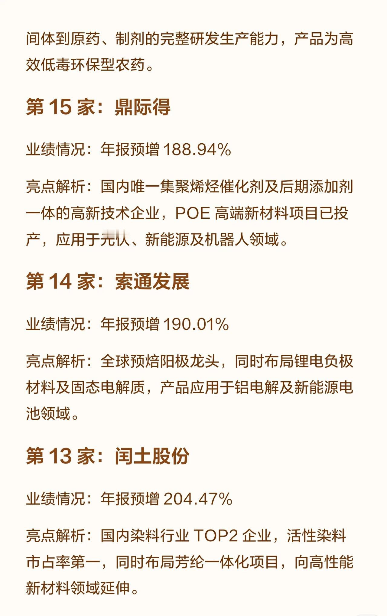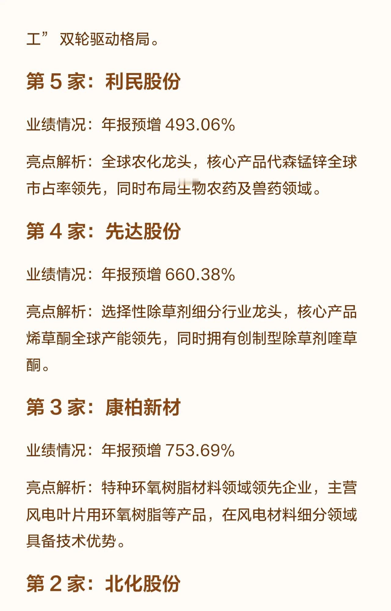 关于化工行业年报预增前20公司的整理,从排名第20名到第1名,按预增幅度由低到高排列,每张图都包含公司名称、业绩预增比例,以及业务亮点解析。 简单总结如下: - 第20名:三美股份,预增165.89%,国内氟制冷剂龙头,受益配额优化与新能源材料需求。 - 第19名:普利特,预增175.25%,高分子新材料龙头,覆盖改性材料、LCP、新能源电池。 - 第18名:多氟多,预增177.80%,氟化工+新能源材料双轮驱动,六氟磷酸锂等。 - 第17名:中复神鹰,预增180.40%,碳纤维龙头,干喷湿纺技术领先。 - 第16名:贝斯美,预增187.85%,二甲戊灵全产业链龙头。 - 第15名:鼎际得,预增188.94%,聚烯烃催化剂及添加剂高新企业,POE新材料投产。 - 第14名:索通发展,预增190.01%,全球预焙阳极龙头,拓展锂电负极材料。 - 第13名:闰土股份,预增204.47%,染料TOP2,活性染料第一,延伸至芳纶。 - 第12名:丰山集团,预增205.11%,高端农药原药及制剂,涉足新能源材料。 - 第11名:金丹科技,预增212.08%,乳酸及衍生物龙头,打通PLA全产业链。 - 第10名:尤夫股份,预增220.66%,涤纶工业丝龙头,用于工业与新能源。 - 第9名:联化科技,预增273.29%,化工定制研发生产龙头。 - 第8名:达威股份,预增388.25%,皮革化学品齐全,专精特新“小巨人”。 - 第7名:富淼科技,预增441.60%,水基化学品与工业水处理综合服务商。 - 第6名:中毅达,预增463.75%,季戊四醇第二,布局磷酸铁锂。 - 第5名:利民股份,预增493.06%,全球农化龙头,代森锰锌领先。 - 第4名:先达股份,预增660.38%,选择性除草剂龙头,烯草酮产能领先。 - 第3名:康柏新材,预增753.69%,特种环氧树脂企业,风电材料有技术优势。 - 第2名:北化股份,预增1000.87%,全球硝化棉龙头,军民融合。 - 第1名:苏利股份,预增1989.92%,农药与阻燃剂精细化工,多产品全球市占率领先。