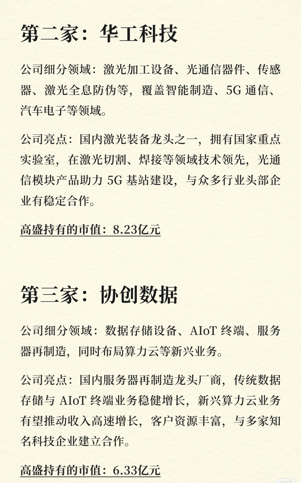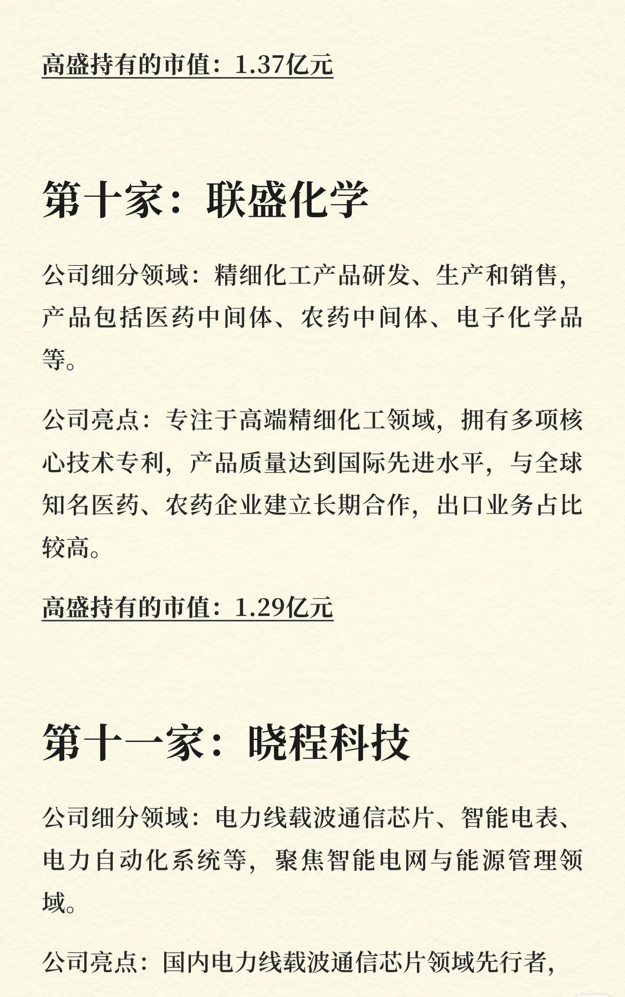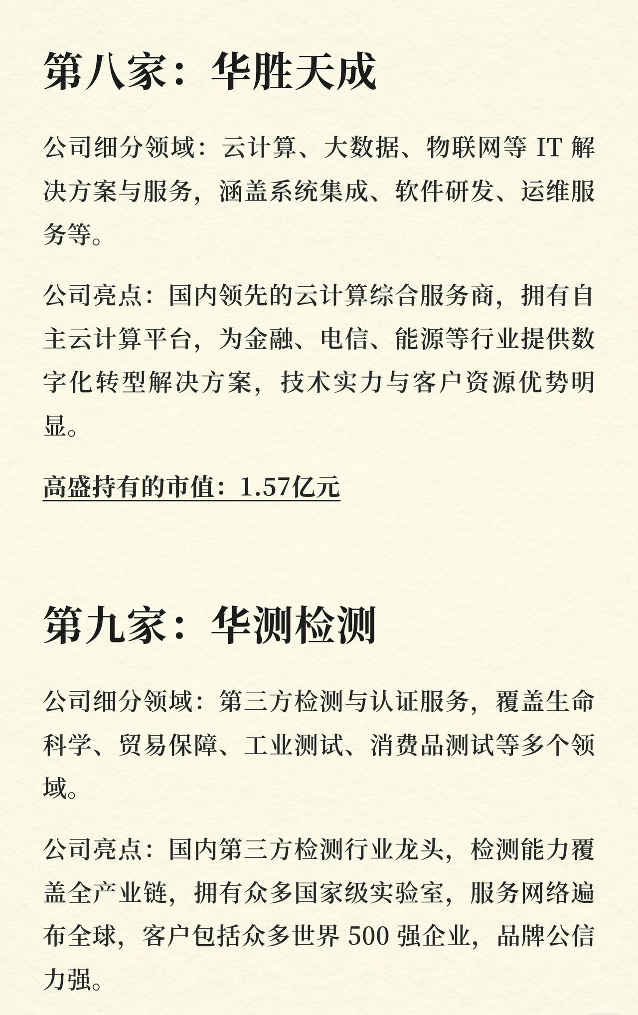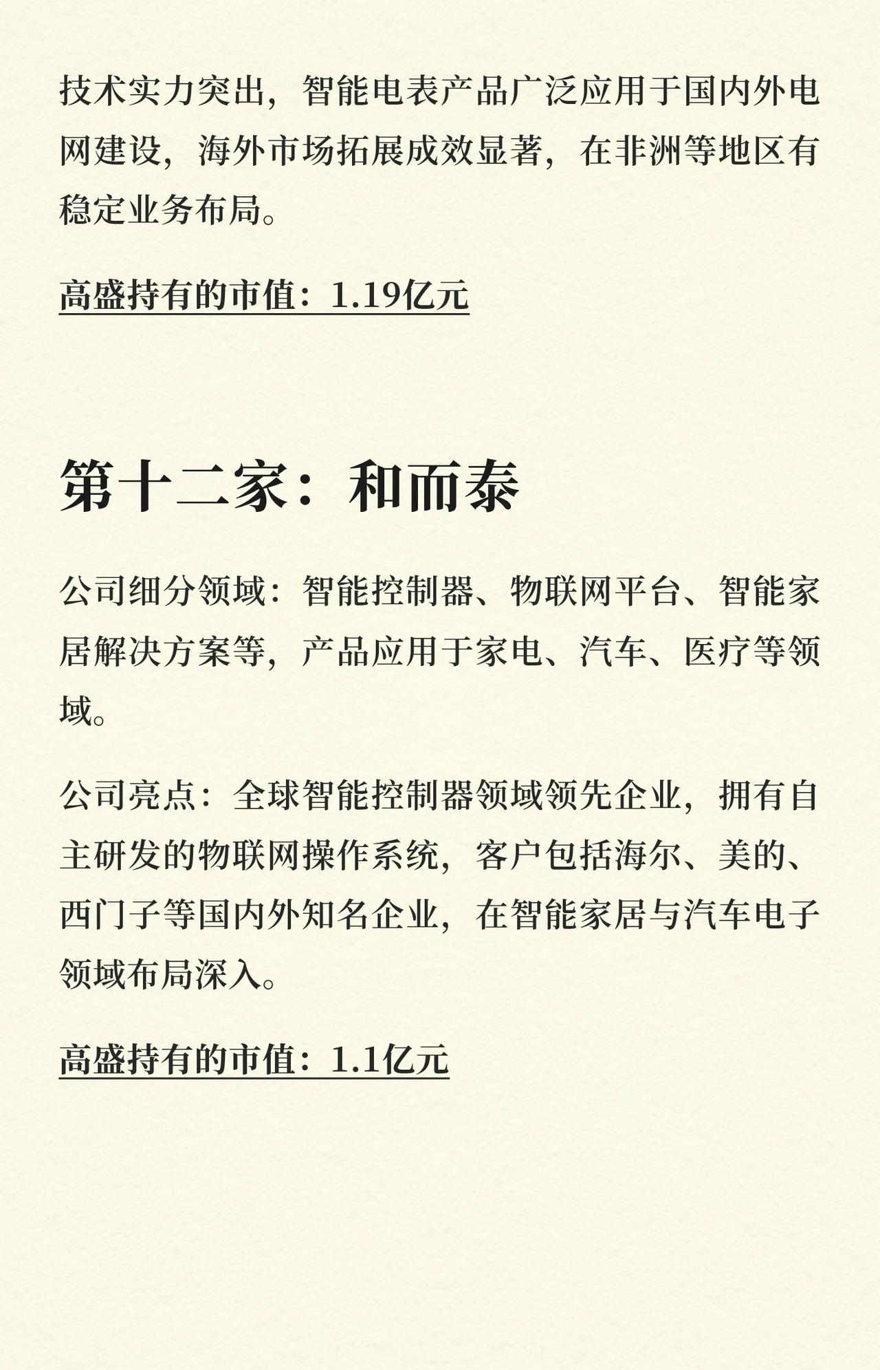 高盛持有的12家隐形冠军企业概览如下: 1. 豪威集团:半导体设计(核心CMOS图像传感器),全球第三大数字图像传感器供应商,汽车CIS市占率约32.9%,2024年出货量超110亿颗,高盛持股市值16亿元。 2. 华工科技:激光加工设备、光通信器件等,国内激光装备龙头,国家重点实验室,高盛持股市值8.23亿元。 3. 协创数据:数据存储设备、AIoT终端、服务器再制造,国内服务器再制造龙头,高盛持股市值6.33亿元。 4. 兴业银锡:银锡等有色金属采选冶,国内银锡行业领先,高盛持股市值4.85亿元。 5. 德明利:存储控制芯片设计、存储模组,存储芯片专精特新企业,高盛持股市值4.39亿元。 6. 淳中科技:专业音视频显控设备,国家级专精特新“小巨人”,高盛持股市值3.07亿元。 7. 剑桥科技:电信宽带接入终端、光模块,光通信创新企业,高盛持股市值2.17亿元。 8. 华胜天成:云计算等IT解决方案,国内领先云计算综合服务商,高盛持股市值1.57亿元。 9. 华测检测:第三方检测认证,行业龙头,覆盖全产业链,高盛持股市值未明确(原文未提)。 10. 联盛化学:精细化工(医药/农药中间体等),高端精细化工,高盛持股市值1.29亿元。 11. 晓程科技:电力线载波通信芯片等,智能电网领域先行者,高盛持股数据未显示。 12. 和而泰:智能控制器、物联网平台,全球智能控制器领先企业,高盛持股市值1.1亿元。
